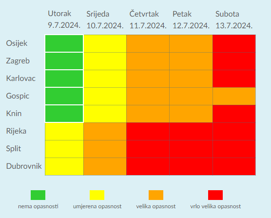 Zbog visokih temperatura za pojedina je područja upaljeno narančasto i crveno upozorenje. Najgore će biti uz obalu, odnosno u Rijeci, Splitu i Dubrovniku, a za vikend je upaljen i najviši stupanj upozorenja za Zagreb, Osijek i Karlovac.