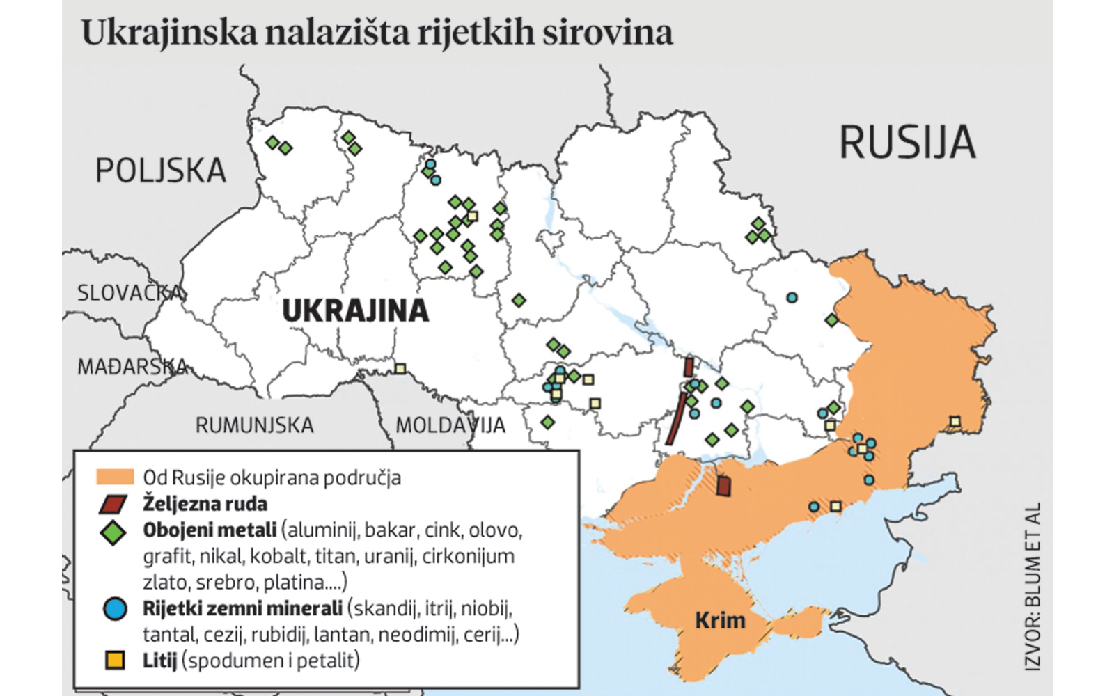 No nije samo hrana geopolitički važna karta, već su tu i ključne sirovine. Ukrajinsko područje Dnjepar-Donjeck čini 80 posto poznate konvencionalne proizvodnje i rezervi nafte, plina i ugljena. No postoji još jači adut: ključne sirovine, a posebno rijetki minerali. Većina identificiranih kritičnih minerala – rijetkih metala – koncentrirani su u Donjecku, Dobri i Krutoj Balki.