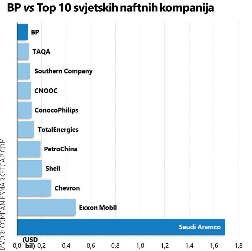 A to je zapravo tek uvod u zanimljivu priču u kojoj je BP ionako već izgubljen slučaj (i figurira tek kao prikladan kriterij usporedbe), izvan Top 10 najvećih naftnih kompanija u svijetu (prema kriteriju tržišne kapitalizacije). Na samom vrhu, osamljen i daleko od svih je Saudi Aramco, jedna od tek dvije kompanije (druga je Buffettov Berkshire Hathaway) u deset najvećih na globalnoj razini koja nema previše veze sa hi-tech sektorom.