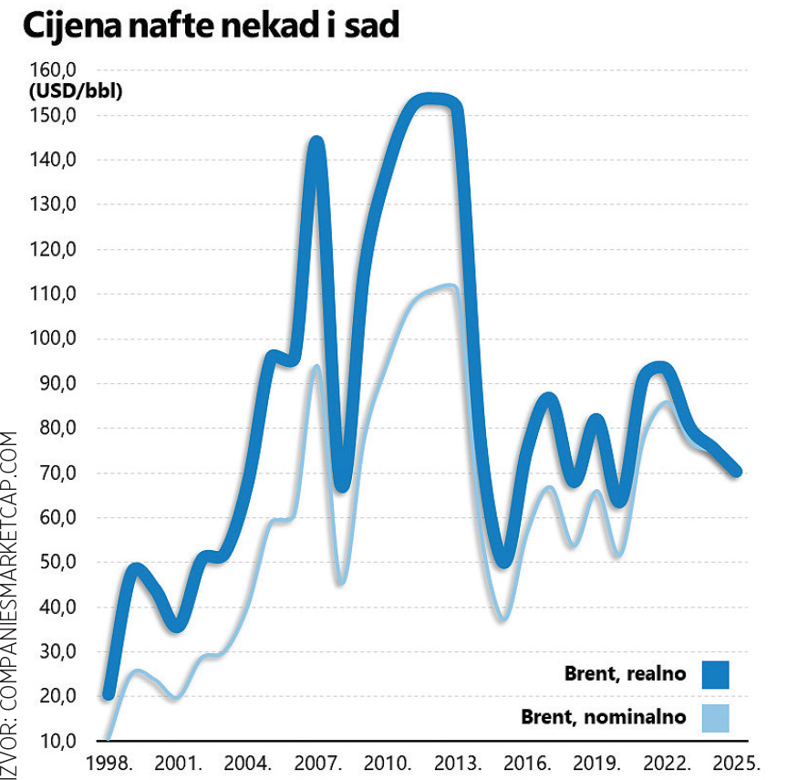 Malo tko pamti kretanje cijena daleko u prošlosti i zbog toga će možda zazvučati nevjerojatno podatak kako je aktualna cijena barela Brent nafte u nominalnim okvirima otprilike jednaka onoj prije – dvadesetak godina. Da i ne spominjemo utjecaj inflacije, koja danas dodatno pojeftinjuje trošak: dodamo li trenutačnoj cijeni od sedamdesetak dolara po barelu (američku) stopu inflacije (nešto više od 60%), dolazimo do realne cijene od čak 114 dolara iz 2005. godine.