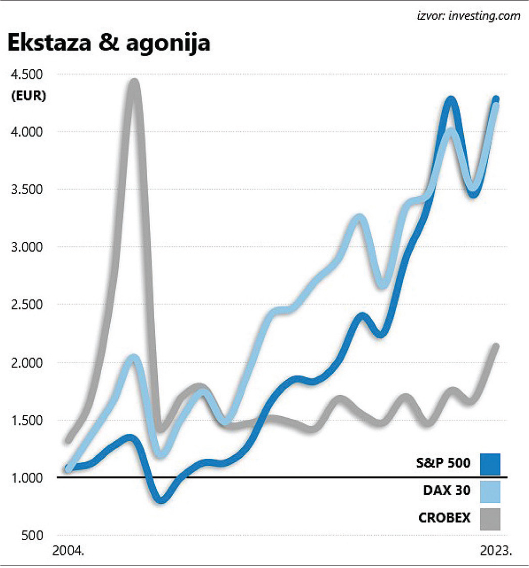 okvirima. Najprikladniji način ilustracije vrtoglavog rasta je hipotetska oklada na tri burzovna indeksa (domaći CROBEX, američki S&P 500 i njemački DAX 30: početni ulog od 1000 eura s početka 2004. godine u hrvatskom je slučaju do kraja 2007. godine narastao do nevjerojatnih 4500 eura i jednostavno se ne može uspoređivati s intenzitetom pozitivnog trenda u New Yorku i Frankfurtu. Vrijednost potonjeg indeksa u promatranom se razdoblju “tek” udvostručila, dok je S&P 500 uknjižio još mršavijih 30% kumulativnog rasta u četiri godine.