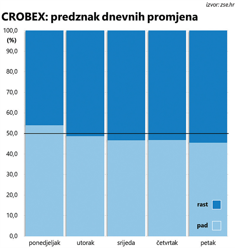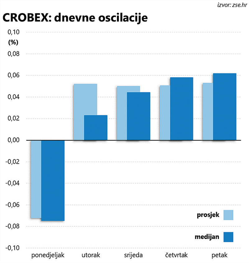 Naime, ponedjeljak je jedini dan u tjednu s prosječnim padom vrijednosti indeksa, koji je usto jednak medijanu, što pokazuje kako nije riječ tek o nekolicini ekstremnih vrijednosti koje bi mogle pomaknuti prosjek dublje na negativan teritorij.