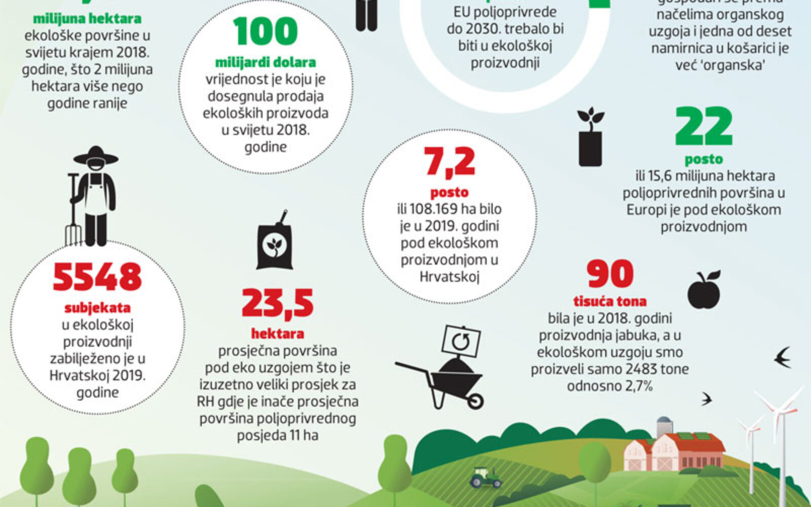 Prosječna površina pod eko uzgojem je čak 23,5 ha, što je izuzetno veliki prosjek za Hrvatsku, gdje je inače prosječna površina poljoprivrednog posjeda 11 ha. Najveće eko površine su u ratarstvu – oko 50 posto svih ekoloških površina, a nakon toga idu pašnjaci s gotovo 40 000 ha.
