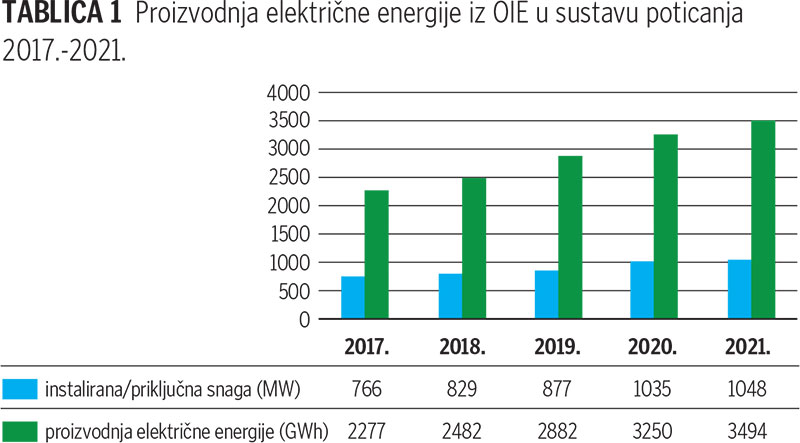 Hrvatska bilježi novi rast proizvodnje električne energije iz obnovljivih izvora energije u okviru sustava poticanja koja u 2021. ukupno iznosi 3.493.985.888,00 kWh (3,5 TWh).