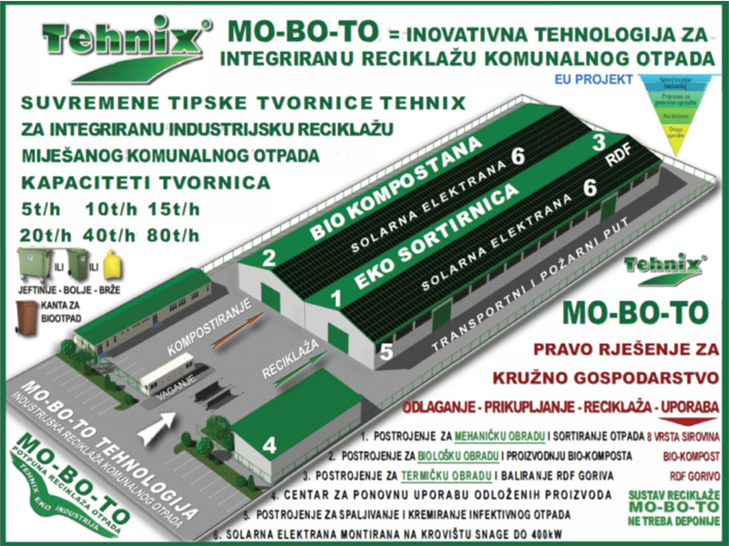 MO-BO- TO tehnologija razvijena u kompaniji Tehnix ima najveći stupanj reciklaže otpada. U sortirnici dobivamo 8 vrsta čistih sirovina. U kompostani dobivamo kompost I. klase. RDF gorivo je kvalitetan energent kapaciteta 4 MW/toni. To je održivost Planete.