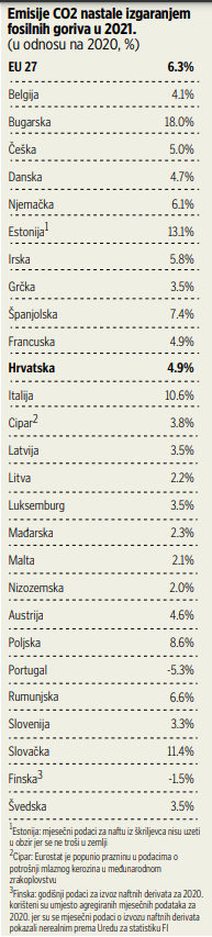Estoniji, Slovačkoj i Italiji, a jedino su Finska i Portugal zabilježile negativnu stopu. Rast emisija CO2 u Hrvatskoj iznosio je 4,9 posto, što je nešto niže od prosjeka EU.