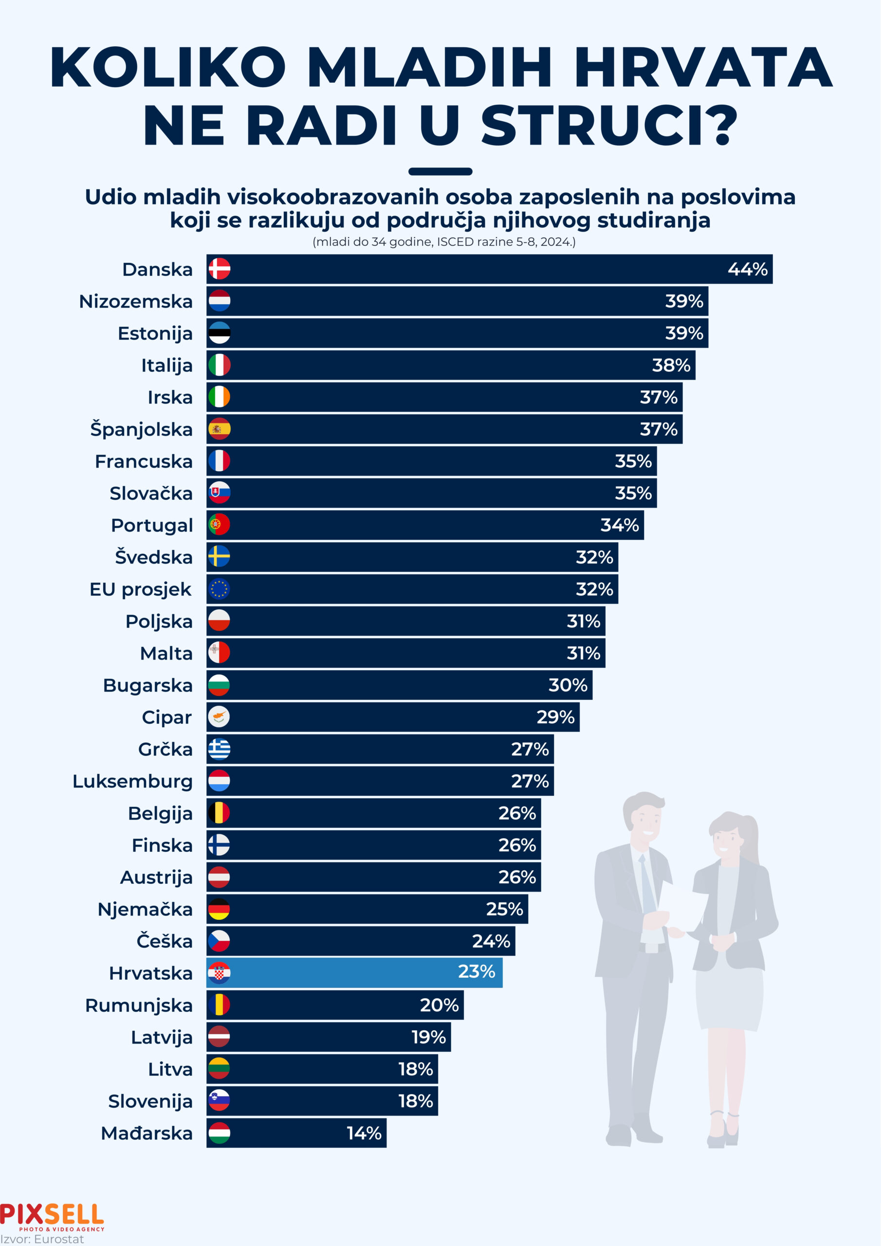 Napravljena je infografika koja prikazuje udio mladih visokoobrazovanih osoba do 34 godine u državama Europske unije koje rade na poslovima izvan područja svojeg studija. Hrvatska ima 23 posto takvih mladih, što je ispod prosjeka EU koji je 32 posto i bliže je donjem dijelu ljestvice. Najveći udio mladih koji ne rade u struci ima Danska s 44 posto, zatim Nizozemska i Estonija (po 39 posto) dok je najmanji u Mađarskoj 14 posto, tu su i susjedi Slovenci s 18 posto.