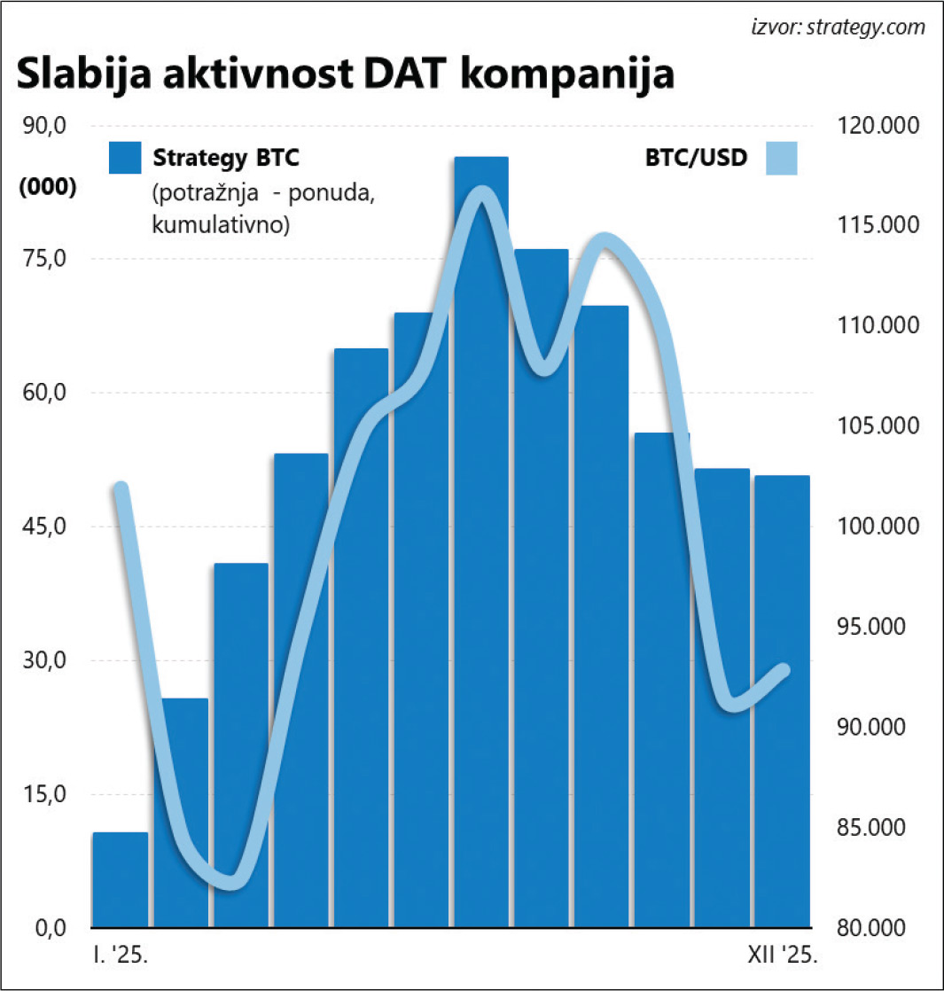 Ukupna brojka u ovom slučaju možda čak i nije toliko bitna koliko intenzitet zgrtanja zaliha: uz stabilan rast ponude (aktivnostima rudarenja), Saylor je tijekom ove godine zapravo apsorbirao cjelokupni rast količine bitcoina u opticaju (i više od toga!). I dok je broj bitcoina u opticaju ove godine porastao za otprilike 150 tisuća, Strategy je u istom razdoblju svoju bilancu obogatio za otprilike 203 tisuće bitcoina. Generirajući dodatnu potražnju, mahom špekulativnog karaktera, DAT segment je itekako pridonio uzletu cijene bitcoina, ali u uvjetima izostanka premije, kada se NAV multiplikator spušta u realne okvire (oko jedan), u DAT kompanijama ne mogu računati na svježi kapital, a time onda nestaje i vrlo bitan izvor dodatne potražnje, što u konačnici djeluje poput utega na tečaj bitcoina.