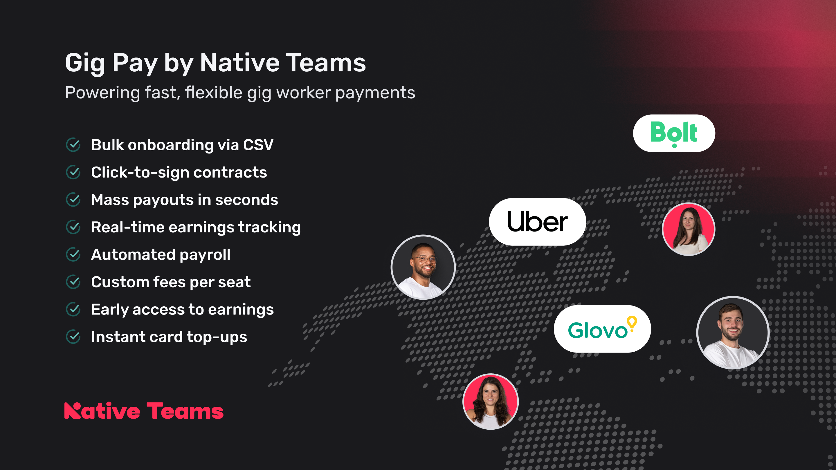 Nakon 13 mjeseci razvoja i testiranja u različitim regijama, Gig Pay je sada dostupan u više od 30 zemalja diljem Europe, Sjeverne i Latinske Amerike te Azije i Pacifika. Da biste dogovorili demo poziv ili saznali više, posjetite: https://nativeteams.com