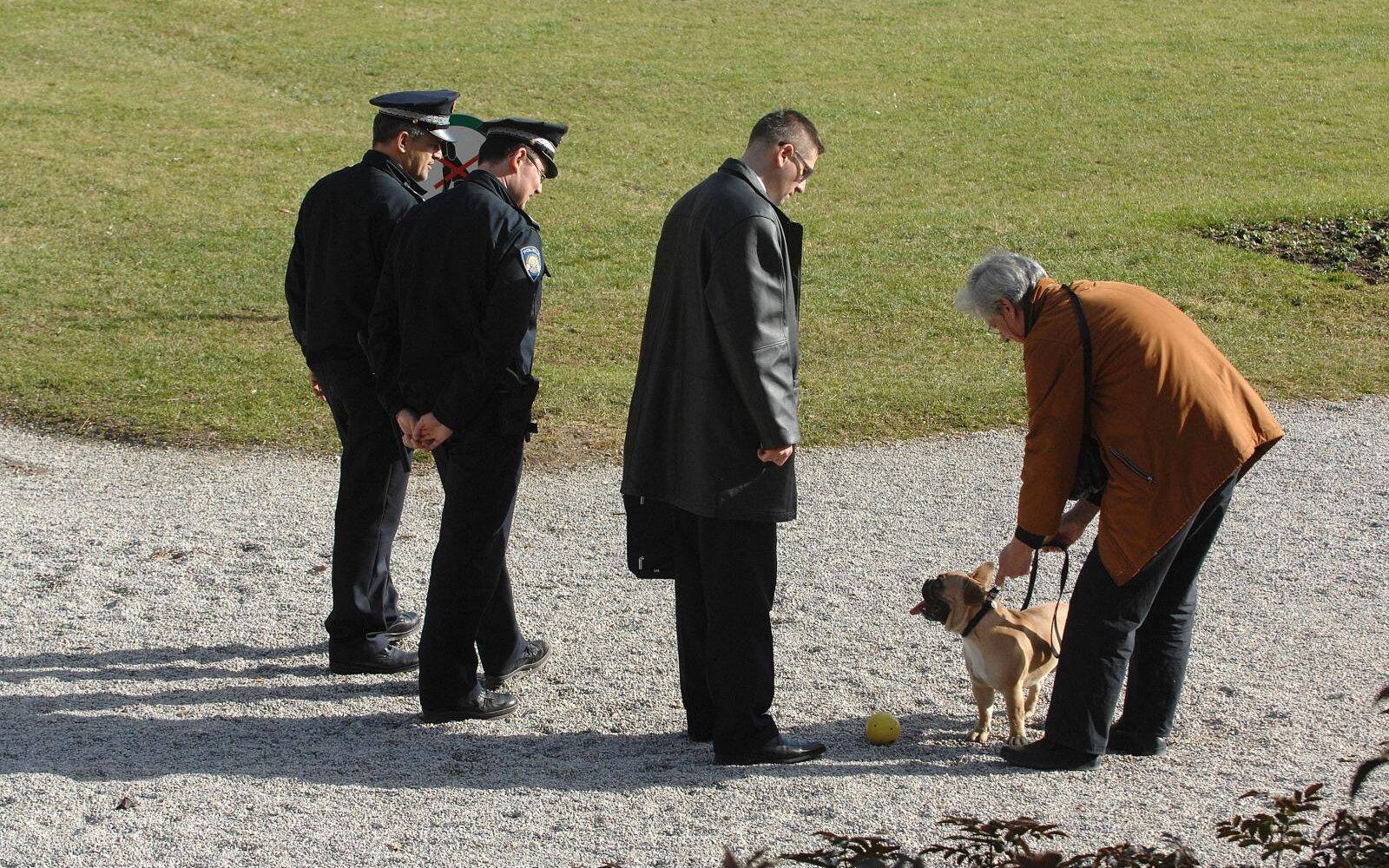 Znači kao na ovoj fotografiji Francuski buldog mora imati brnjicu i lajnu inače dva policajca i ovaj dugački će kazniti gazdu. Da oni sebi stave brnjicu bilo bi puno pametnije.