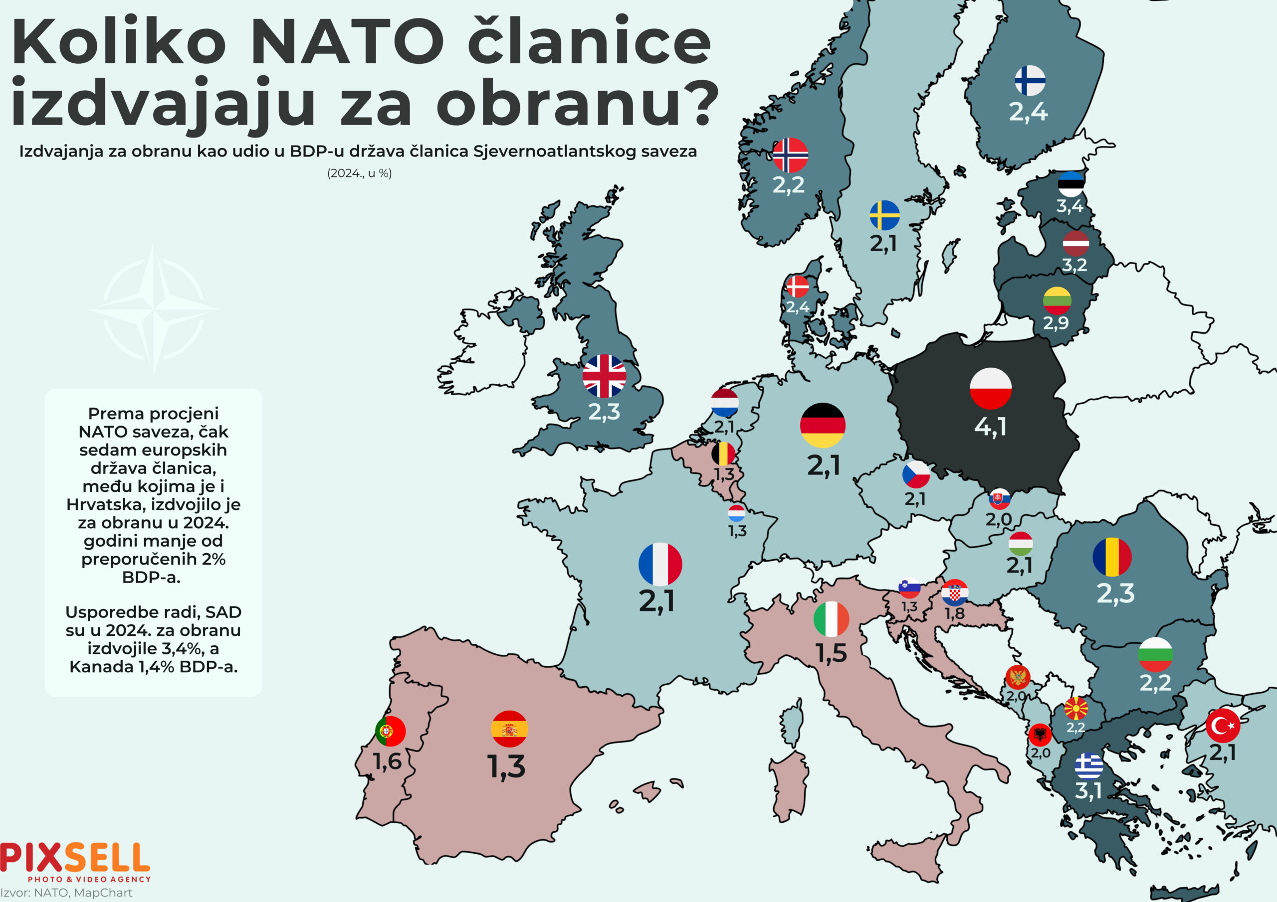 Nove članice Švedska i Finska, koje su se priključile NATO-u 2023. i 2024., također su podigle vojna izdvajanja iznad dva posto BDP-a.
