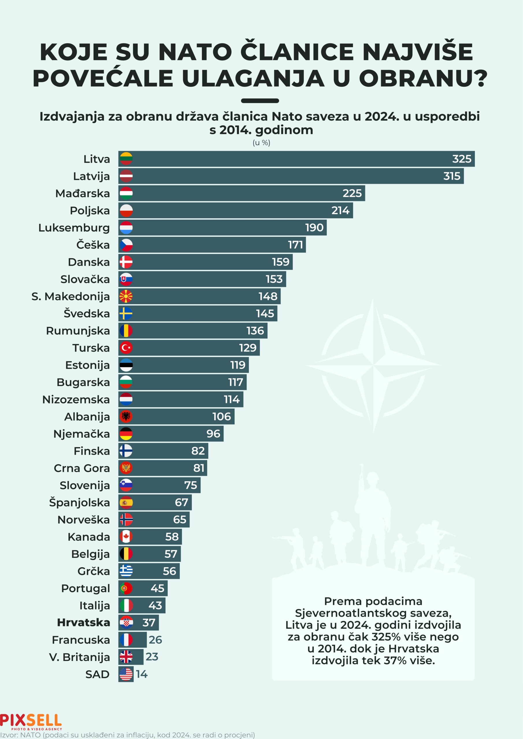 NATO-vi podaci vidljivi u infografici, koje je obradila i prikupila platforma Statista, pokazuju da su izdvajanja u periodu od 2014. do 2024. godine značajno porasla u svim zemljama. Najviši rast, od čak 325 posto, bilježi Litva, slijedi Latvija s 315 posto, Mađarska s 225 posto, Poljska s 214 posto, a top pet zatvara Luksemburg sa 190 posto. Hrvatska je prema ovim podacima pri dnu s 37 posto.