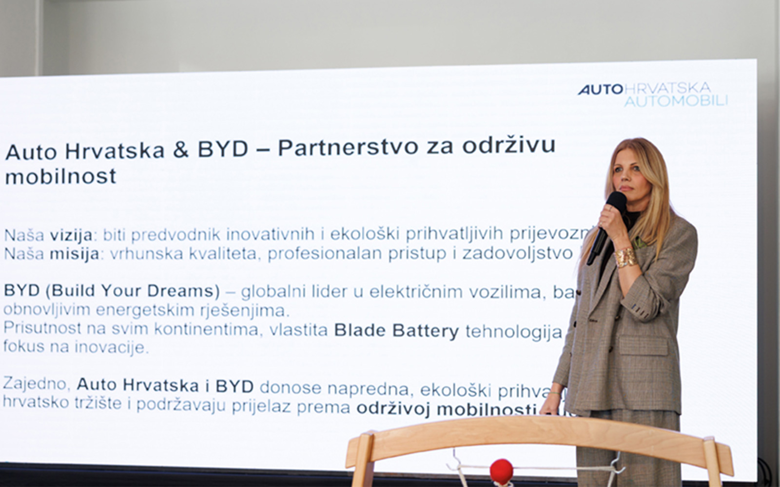 Gospođa Marija Zagorec, voditeljica marke BYD predstavila je bogatu ponudu BYD centra u Splitu te naglasila da BYD nije samo sinonim za izvrsnost u električnoj mobilnosti nego predstavila i odlične plug in hibridni modele sa dosezima preko 1080 km sa punim spremnikom goriva i baterijom. Naglasila je da će SUV segment Seal U DM-i , limuzina Seal 5 i Seal 6 koji uskoro dolazi na tržište sigurno zauzeti značajno mjesto na hrvatskom tržištu.