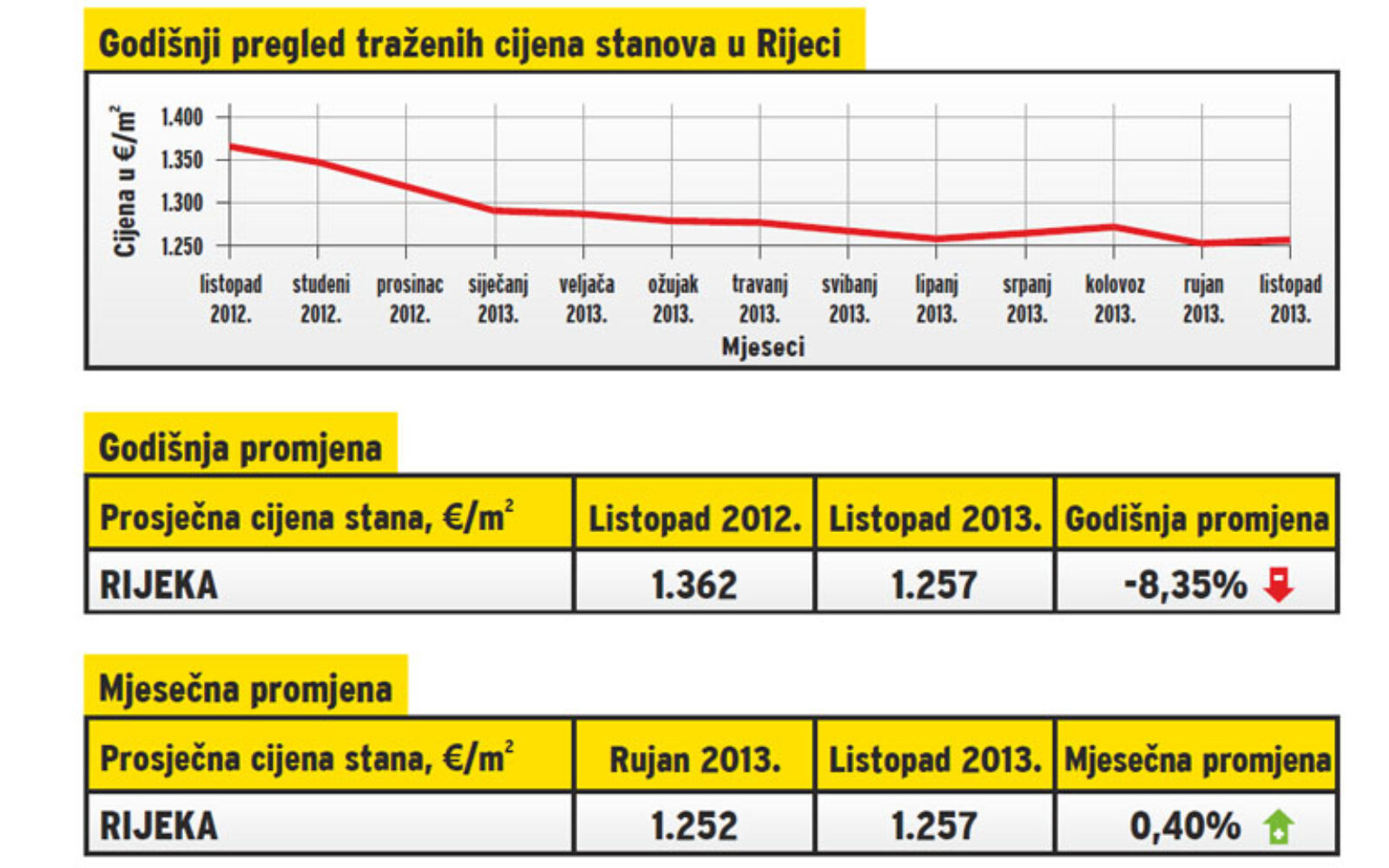 Prosječna cijena stana u Rijeci, u listopadu 2013. bila je 1.257 eura za metar četvorni, što je 8,35 posto manje nego u istom mjesecu prošle godine, priopćeno iz RI Telefax Burze.