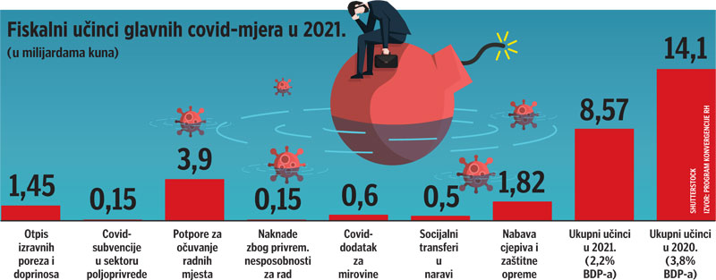 Ta je jednokratna mjera ove godine pridodana nizu uvedenih još lani, no ukupno će proračunski teret raznih potpora i pošteda za građane i gospodarstvo, ali i specifičnih troškova zdravstvenog sustava povezanih s pandemijom Covid-19 biti oko 5,5 milijardi kuna manji nego lani.