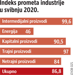 U svibnju 2020. u usporedbi sa svibnjem 2019. Trajni proizvodi za široku potrošnju manji su za 28,5%, Kapitalni proizvodi za 25,1%, Intermedijarni proizvodi za 17,7% i Netrajni proizvodi za široku potrošnju za 17,5%, a Energija je veća za 30,2%.