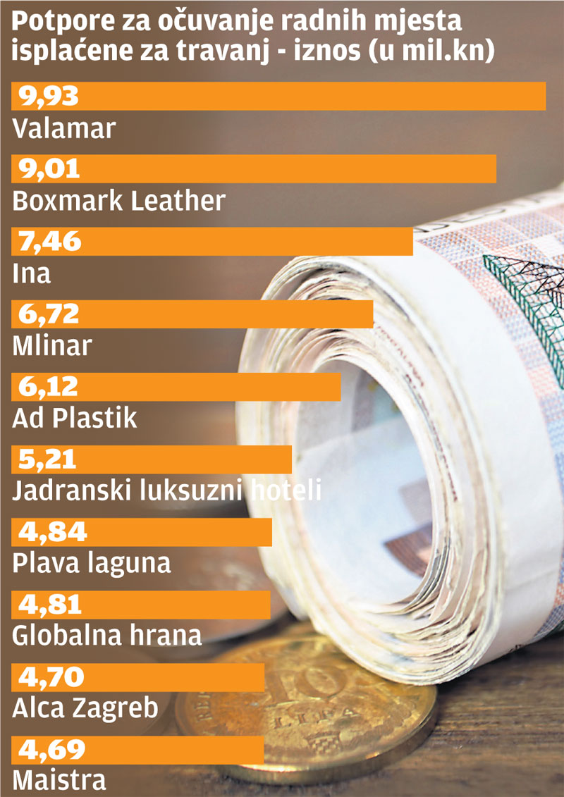 Prema najnovijim podacima Hrvatskog zavoda za zapošljavanje, zaključno s 1. srpnjem potpore za očuvanje radnih mjesta u uvjetima pandemije virusa Covid-19 u lipnju je za mjesec svibanj koristilo ukupno 96.792 poslodavca, a na račune im je sjelo 1,81 milijardi kuna.