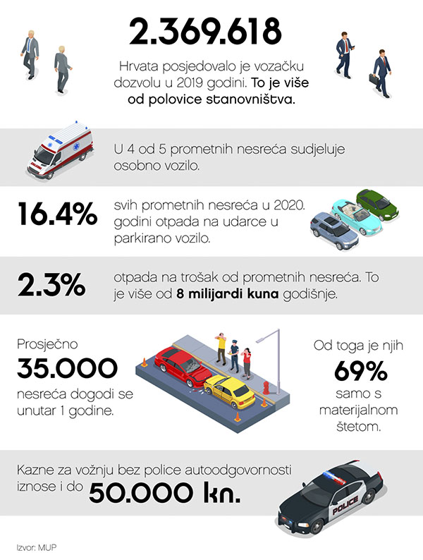 Prošle godine, više od polovice stanovništva Hrvatske imalo je vozačku dozvolu. Iste se godine dogodilo preko 26.000 prometnih nesreća što znači da ih je dnevno bilo više od 71. Kada gledamo strukturu nesreća, gotovo 70 posto njih uključivalo je samo materijalnu štetu, a većina vozila koja su bila dio nesreća su osobni automobili. Svaka prometna nesreća tragedija je iz očitih razloga – gubitka života ili teških ozljeda. Međutim, prometne nesreće svaku državu koštaju od 1 do 3 posto bruto domaćeg proizvoda, a isto je i s Hrvatskom. Nju prometne nesreće godišnje koštaju preko osam milijardi kuna, ili 2.3 posto BDP-a.