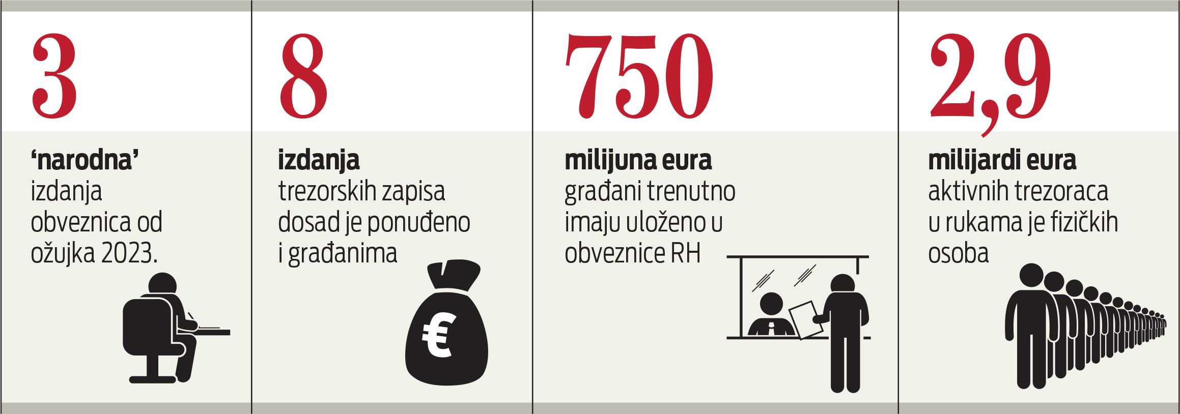 Inače, prva sljedeća prilika za ulaganje u trezorske zapise slijedi za manje od tri mjeseca. Početkom lipnja, naime, dospijeva jednogodišnji trezorac u kojemu građani drže više od 580 milijuna eura.