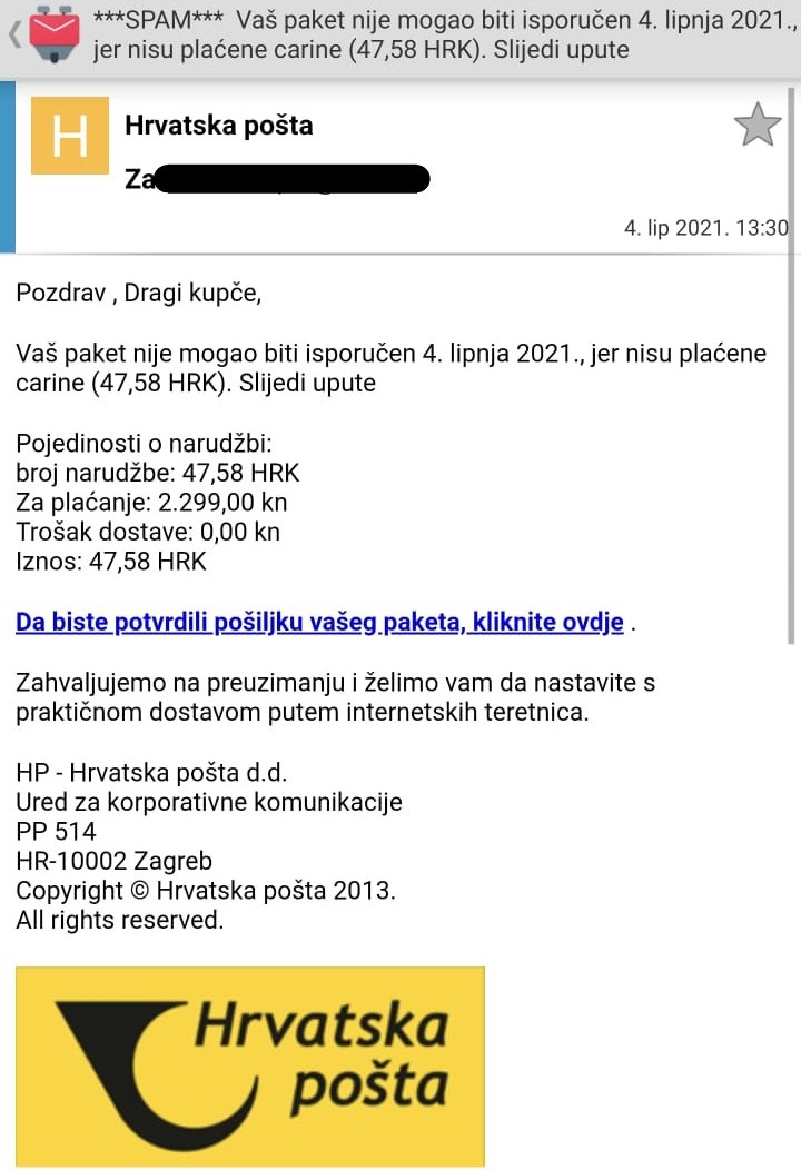 U proteklih tjedan dana na e-mail adrese korisnika počele su stizati lažne poruke u kojima se od njih traži uplata carinske naknade kako bi mogli primiti paket. Pozivamo korisnike da ne odgovaraju na takve poruke te ne otvaraju poveznice koje se u njima nalaze, jer se time izlažu riziku od krađe svojih podataka.