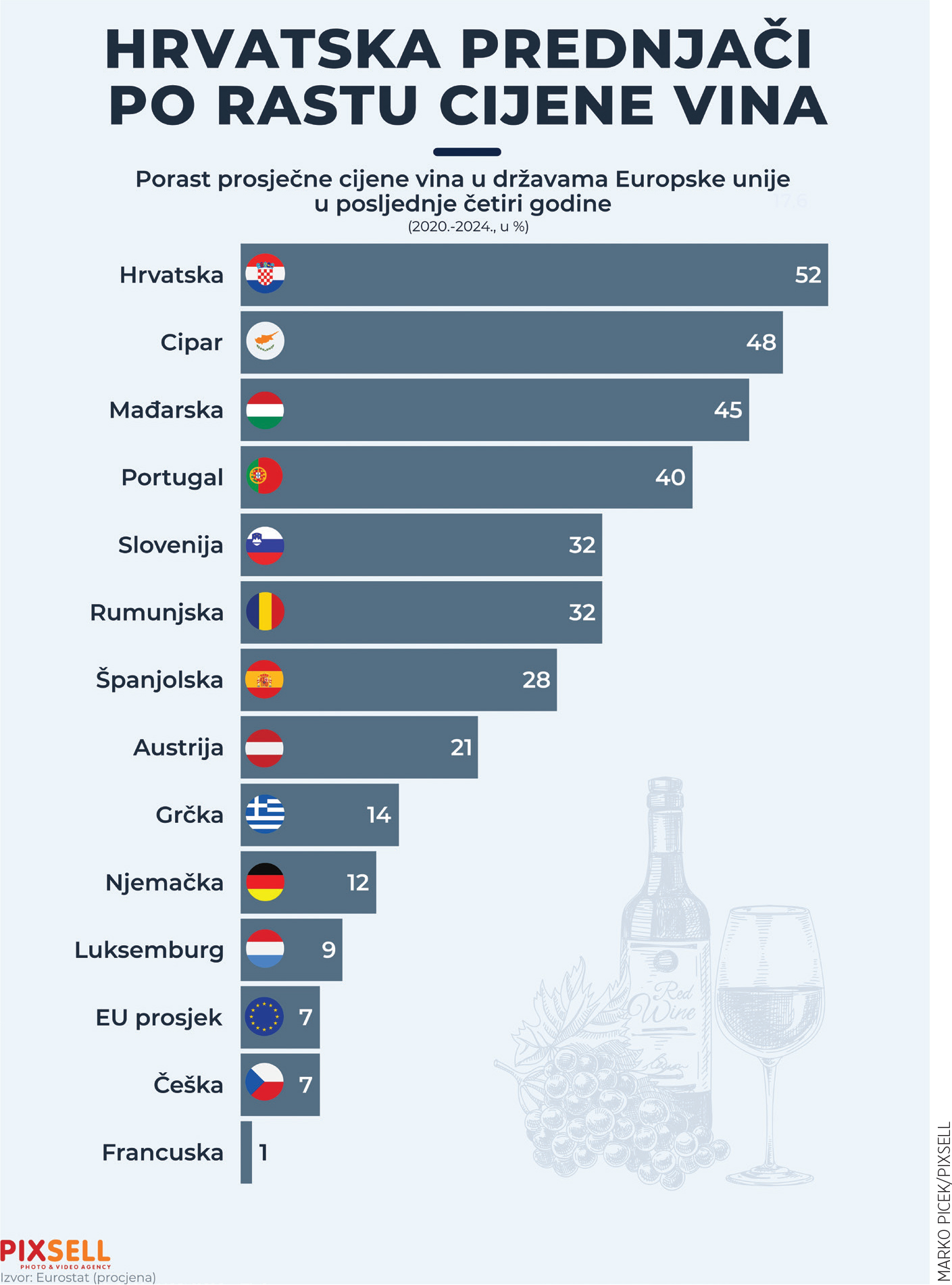 Hrvatska je prva u Europi po rastu cijena vina koje je u četiri godine poskupjelo za čak 52 posto, pokazuju podaci Eurostata. I taj trend se nastavlja. Na Cipru je vino poskupjelo 48 posto, a u Mađarskoj 45 posto.