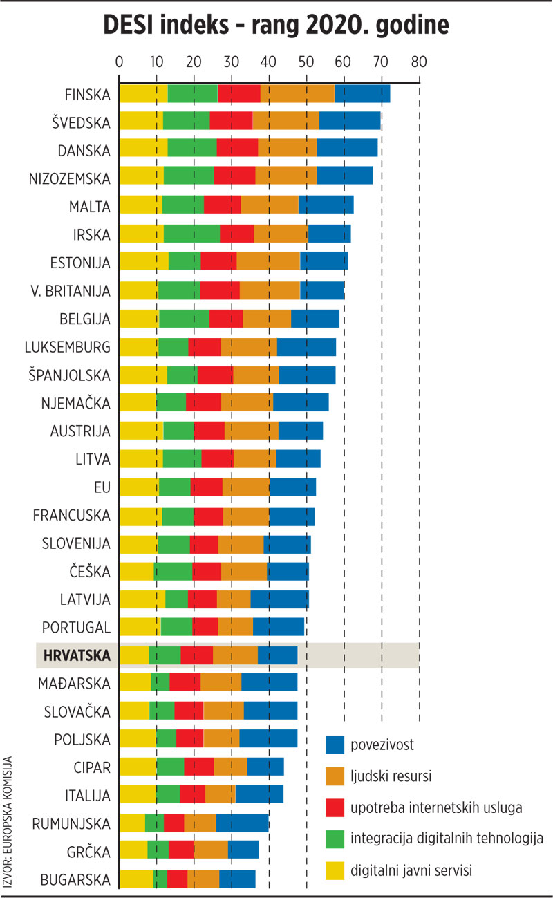 Hrvatska je po DESI indeksu, najvažnijoj mjeri digitalizacije društva i gospodarstva na području EU, ostala na 20. mjestu od 28 članica, kao i lani, te je s 47,6 poena i dalje ispod EU prosjeka od 52,6.