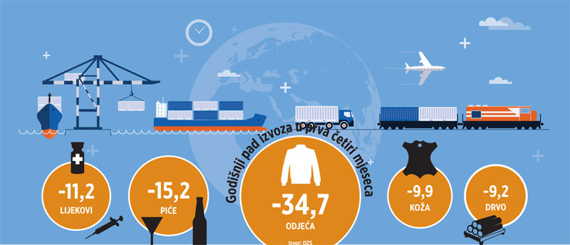 Izvezeno je roba u vrijednosti 5,59 milijardi eura, pri čemu je veći pad zabilježen na tržištima izvan EU (17,7%), dok je u članicama EU, s kojima se i realizira veći dio trgovine, rezultat bio slabiji za 6,4 posto, a prodano je roba vrijednih nešto manje od 4 milijarde eura.