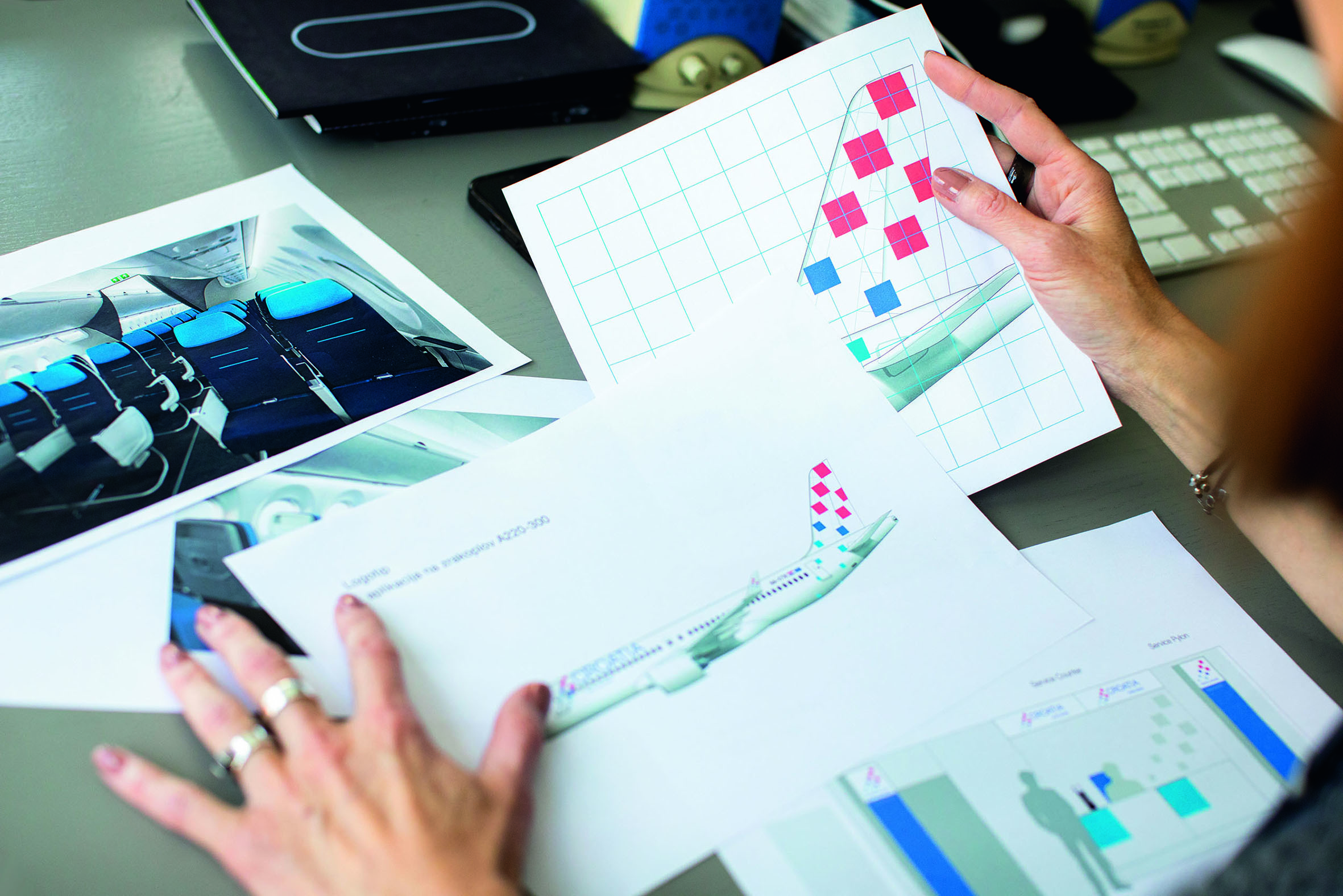 “Nije ni najmanje lako aplicirati kvadrate na zakrivljenu površinu kao što je zrakoplov. Na sreću, stekla sam višegodišnje iskustvo dizajnirajući više tipova zrakoplova kao što su Boeing, ATR, Dash8-Q400, Airbus A320 i A319 te sada Airbus A220. S prvim zrakoplovom doslovno sam dobila sijede (smijeh). Čini se lako, ali teže je nego bilo koji drugi dizajn. Svaka pogreška se vidi. Vraćala sam tehničke nacrte nekoliko puta i tek sam na licu mjesta u Kanadi uz suradnju s radnicima u proizvodnji uspjela dobiti ono što sam zamislila. Da shvate što želim, morala sam se popeti na skelu i zalijepiti pik-trake. Svi nacrti su pali u vodu i radili se ponovno naknadno. Prava avantura. Paralelno je išao redizajn i interijera zrakoplova, koji nije nimalo manje zahtjevan. U avijaciji sve treba proći veliki broj testova i kontrola, a i puno je ograničenja jer sve elemente mogu raditi jedino licencirane tvornice”, opisuje Ivanković.