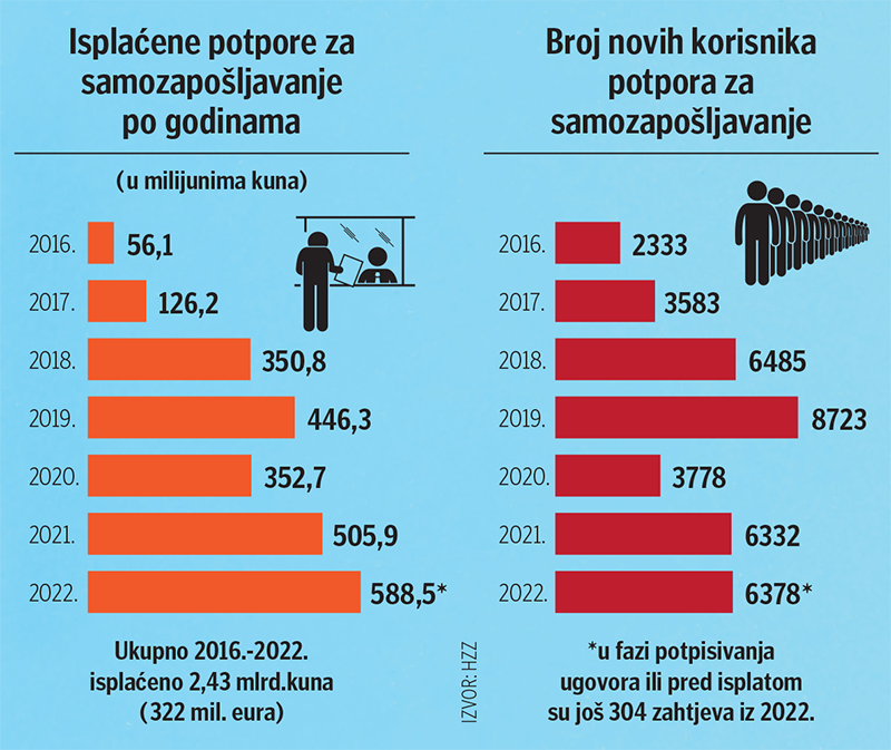 U posljednjih pet godina, iz iznimku pandemijske 2020., godišnje se šest-sedam tisuća nezaposlenih osoba uz pomoć tih poticaja odlučilo pokrenuti vlastiti posao osnivanjem tvrtki ili obrta. A premda rekordan broj novouključenih korisnika tih potpora i dalje drži pretpandemijska 2019. s čak 8723 nova korisnika, prošle godine isplaćen je rekordan iznos tih potpora, od gotovo 590 milijuna kuna.