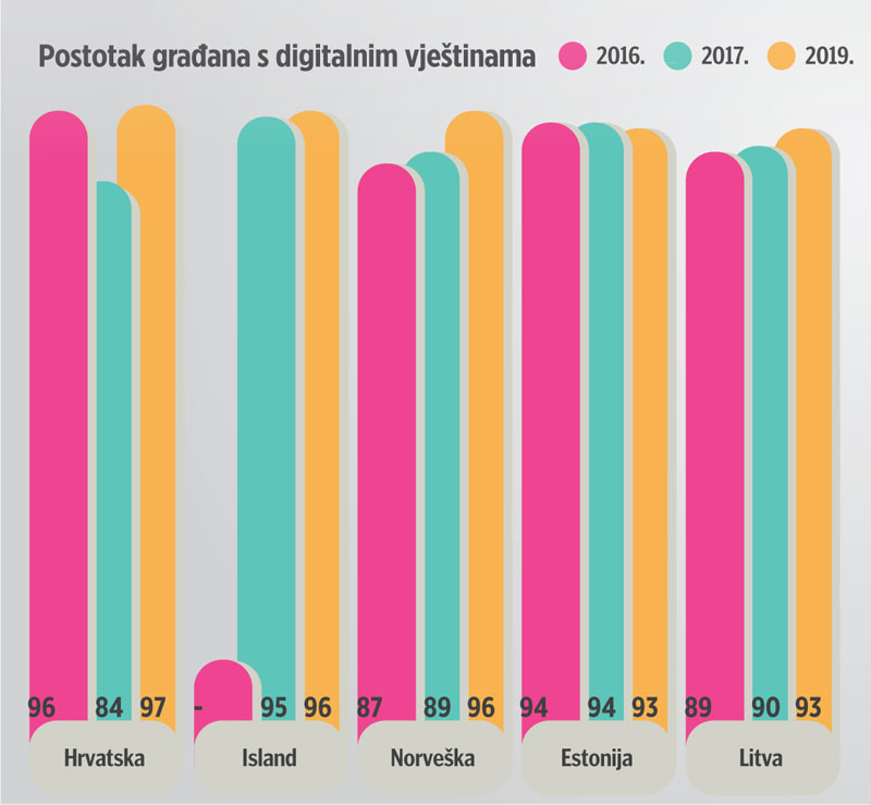 U Češkoj je on 91 posto, a u Austriji i Finskoj 89 posto. Od nama susjednih zemalja osnovne digitalne vještine ima tek 82 posto mladih u Sloveniji, 79 posto mladih u Srbiji, 68 posto u Mađarskoj i 65 posto u Italiji.