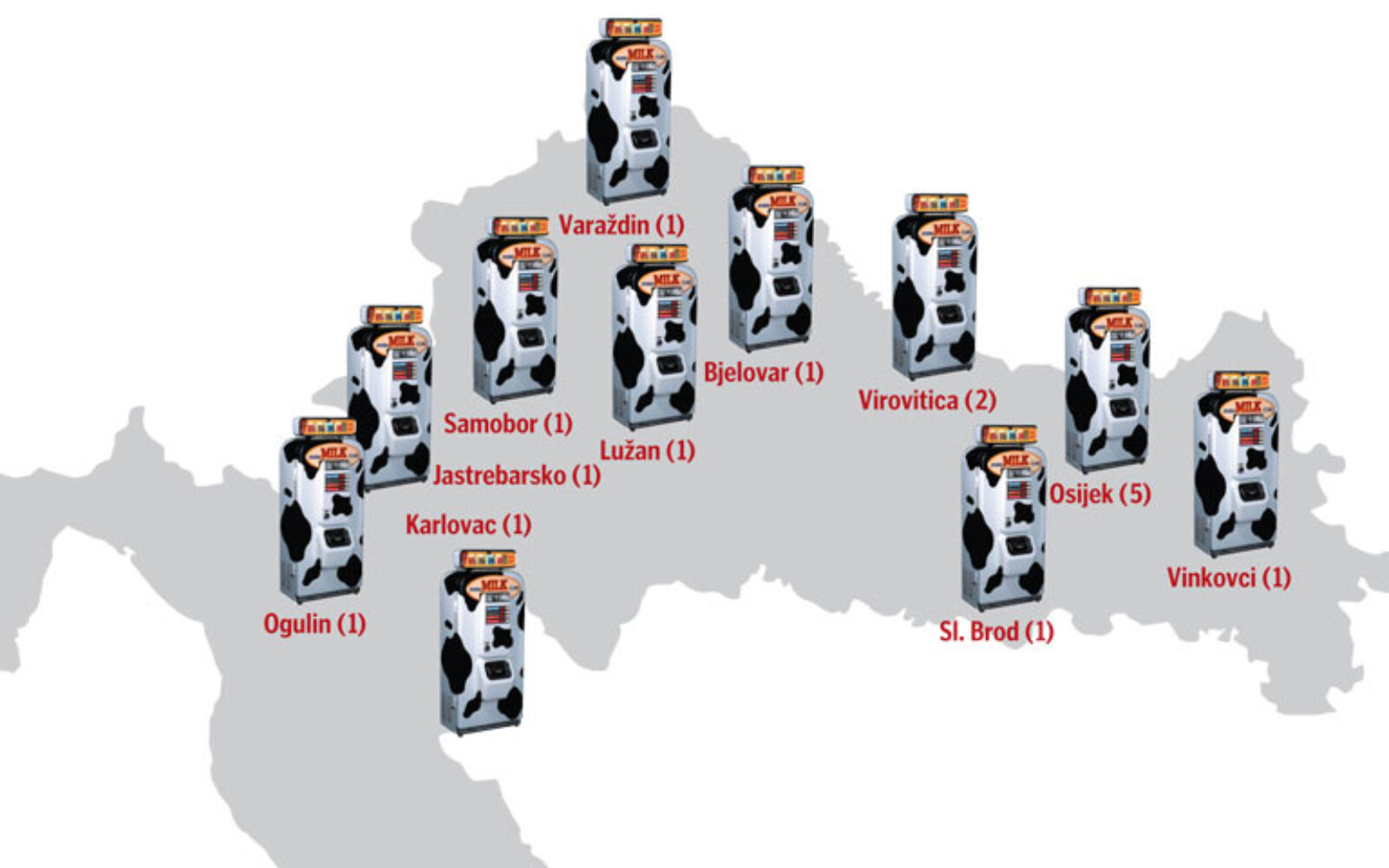 Ukupno je diljem Hrvatske trenutačno instalirano 17 mljekomata, a Žito je prvak te kratke liste s njih pet i planom da uskoro postavi još dva. Prvi su postavili lani u svibnju, svih pet ih je u Osijeku, a prodaja je, ističu, sve bolja. Pospješila ju je nedavna afera s aflatoksinom. Buduće lokacije Žito će tražiti u promjeru 30-40 km od farme Mala Branjevina, gdje drže 1170 krava. Ta se udaljenost smatra optimalnom za isplativost projekta."Za Žito ovaj model prodaje nije temeljen na profitu nego je zamišljen više kao marketinški projekt na popularizaciji zdrave hrane", ističe Peko.