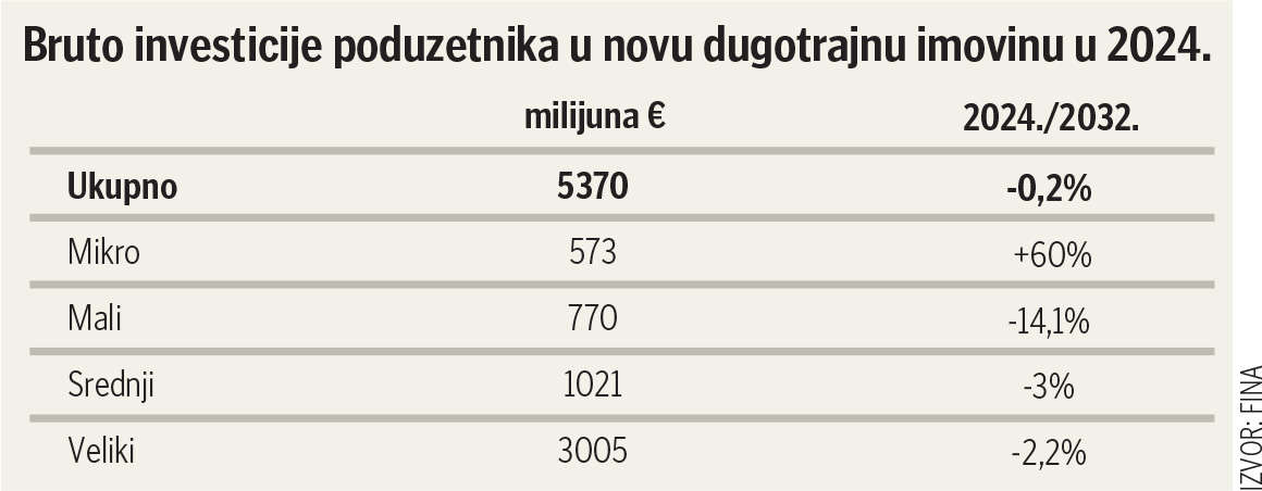 Prema Fini, iznosile su nepunih 5,4 milijarde eura, odnosno 0,2 posto manje nego godinu prije, a samo u kategoriji mikro poduzetnika su porasle, i to čak 60 posto (na 573 milijuna). Kod velikih poduzetnika, koji su iznijeli više od tri milijarde eura investicija u novu imovinu, kao i kod srednjih s nešto više od milijardu eura, zabilježen je godišnji pad za 2,2 odnosno 3 posto, a najizraženiji pad, čak 14 posto, iskazan je u kategoriji malih poduzetnika.