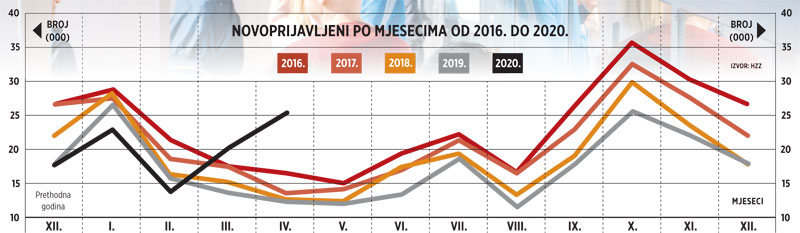 U travnju je, pak, u odnosu na kraj ožujka nezaposlenih bilo 15,7 tisuća više, a u odnosu na lanjski travanj 28 tisuća, za petinu više. Možda najslikovitija je evidencija novoprijavljenih na burzu rada, kojih je pristiglo gotovo 25,5 tisuće. Na godišnjoj razini to je udvostručenje broja novih u evidenciji, s tim da je najveći broj, više od 87%, došao prekidom radnog odnosa.