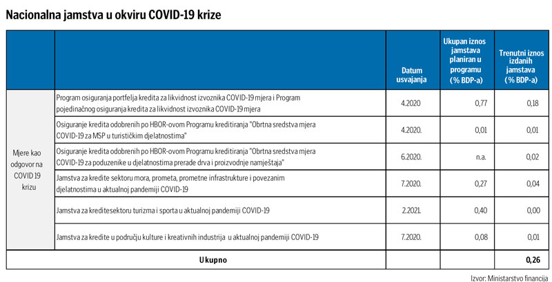 No, za razliku od izravnih fiskalnih potpora koje su se proširivale i produžavale, nacionalni jamstveno-kreditni programi za gospodarstvo u odnosu na planske veličine prilično su podbacili. Većina tih programa usvojena je još lani, a dosad je po njima odobreno manje od petine planiranih iznosa jamstava.