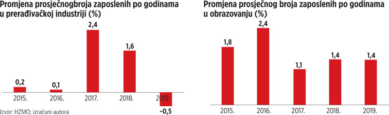 U zdravstvenoj zaštiti zaposlenih je 12 posto, odnosno gotovo 12 tisuća više, ukupno u 2019. 109 tisuća. Sličan trend kao u zdravstvu ima i obrazovni sektor, u kojemu je zaposlenih u 2019. bilo 114 tisuća, 8 posto više nego 2014. Kritičari će reći da je obrazovanje uvijek bilo prostor za zapošljavanje, no posljednjih godina broj razreda u hrvatskim školama se smanjio za oko 1300, pa se postavlja pitanje zašto je broj zaposlenih rastao.