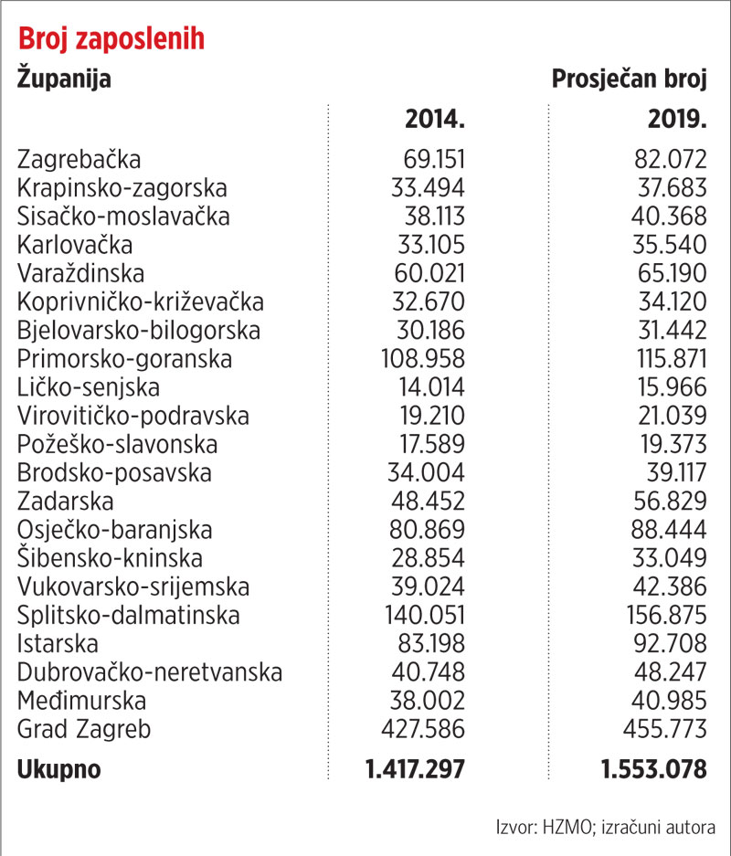 Najpozitivnijim kretanjem zaposlenosti izdvojilo se nekoliko županija, prije svega Zagrebačka u kojoj je u tom razdoblju broj zaposlenih povećan za 13 tisuća, gotovo za 19 posto. Skok bilježe i dvije “morske” županije – Dubrovačko-neretvanska i Zadarska, a od kontinentalnih iskorak su imale i Brodsko-posavska i Krapinsko-zagorska županija.