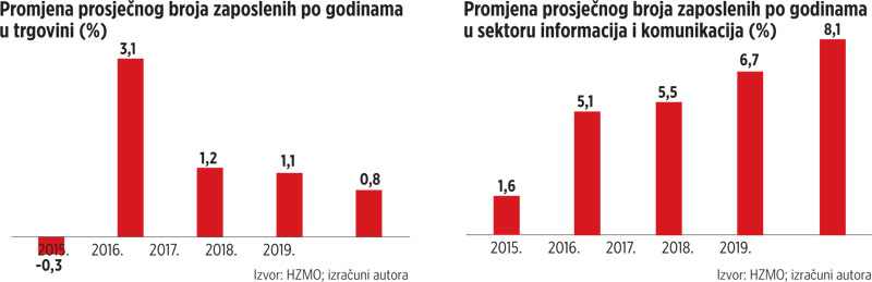 U trgovini se lani bilježi na HZMO-u ukupno 242 tisuće radnika, a u odnosu na 2014. njihov je broj porastao za 13,6 tisuća. Najveći porast zbio se 2016. godine, nakon što je prethodno zaposlenost bila u padu. Iznadprosječnim napretkom izdvaja se još i građevinski sektor, u kojemu je u tom razdoblju broj zaposlenih povećan za gotovo 20 tisuća i za više od 21 posto. Pri tom se izraženiji rast radnika u građevinskoj branši bilježi posljednje dvije godine.