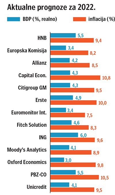 Kad je posrijedi inflacija, očekivanja stranih analitičara u prosjeku se vrte oko HNB-ovih procjena (između 9 i 9,6 posto). Nešto nepovoljniji ishod u pogledu prosječne inflacije predviđaju u Capital Economicsu s prognozom od čak 10,8 posto, te u Oxford Economicsu (9,8 posto). Na dvoznamenkastoj prognozi inflacije danas su, pak, i neke domaće financijske grupacije.