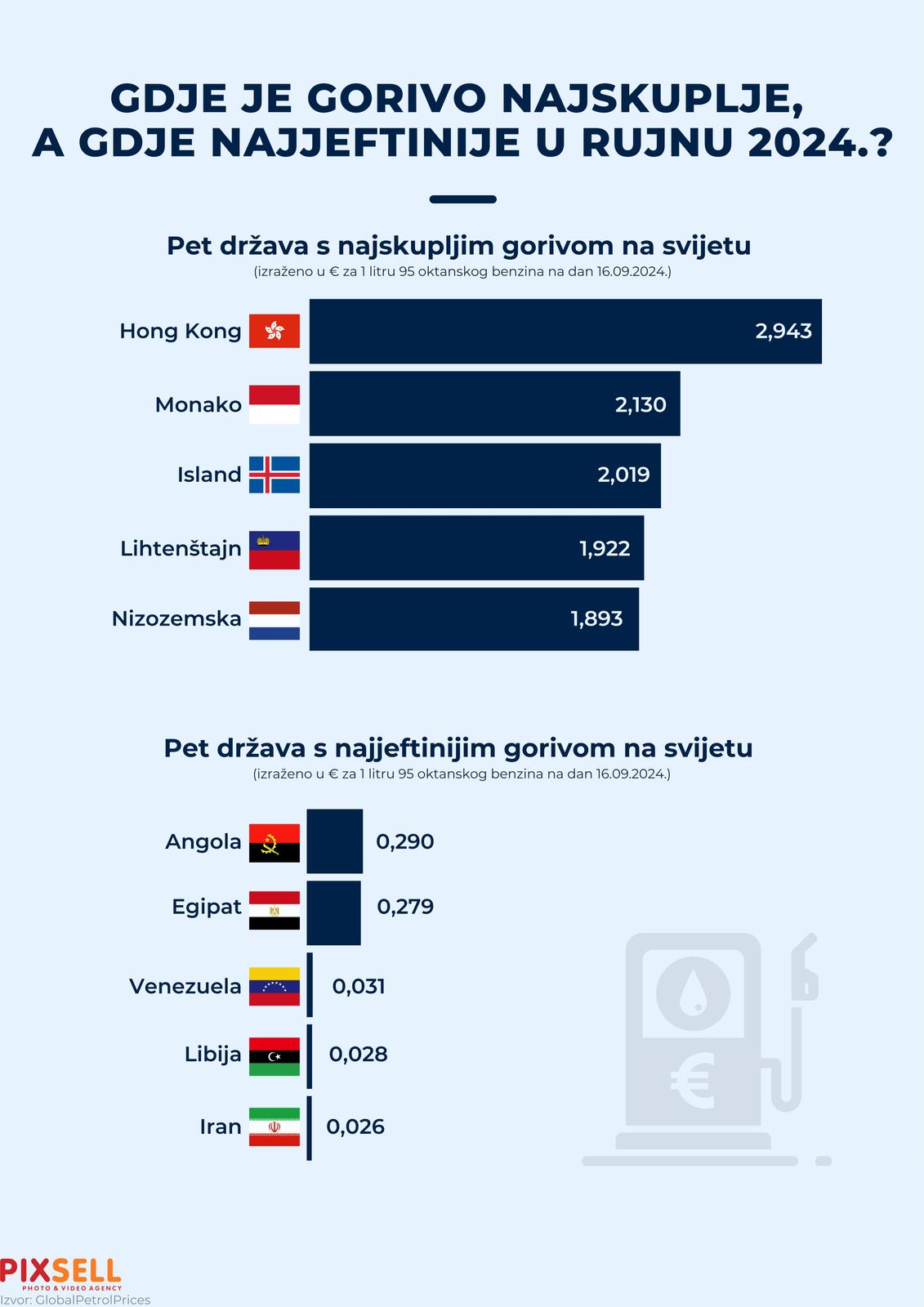 Najjeftinija litra benzina na svijetu je u Angoli, gdje stoji svega tri eurocenta (0,029 eura). U Egiptu stoji 0,279 eura, a u Venezueli 0,031 eura.