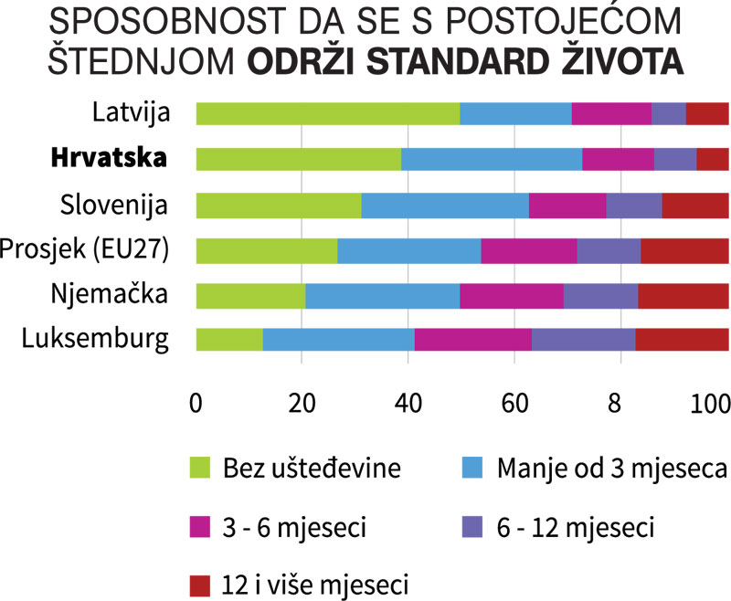 Te brojke, također, treba uzeti s oprezom zbog velikih razlika po zemljama. Na pitanje “Da vaše kućanstvo ne prima nikakav dohodak, koliko biste dugo održavali nepromijenjen standard života?” u Hrvatskoj je gotovo 40 posto ispitanih izjavilo da nema štednje, a oko trećine je reklo da bi isti standard uspjeli održati manje od tri mjeseca.