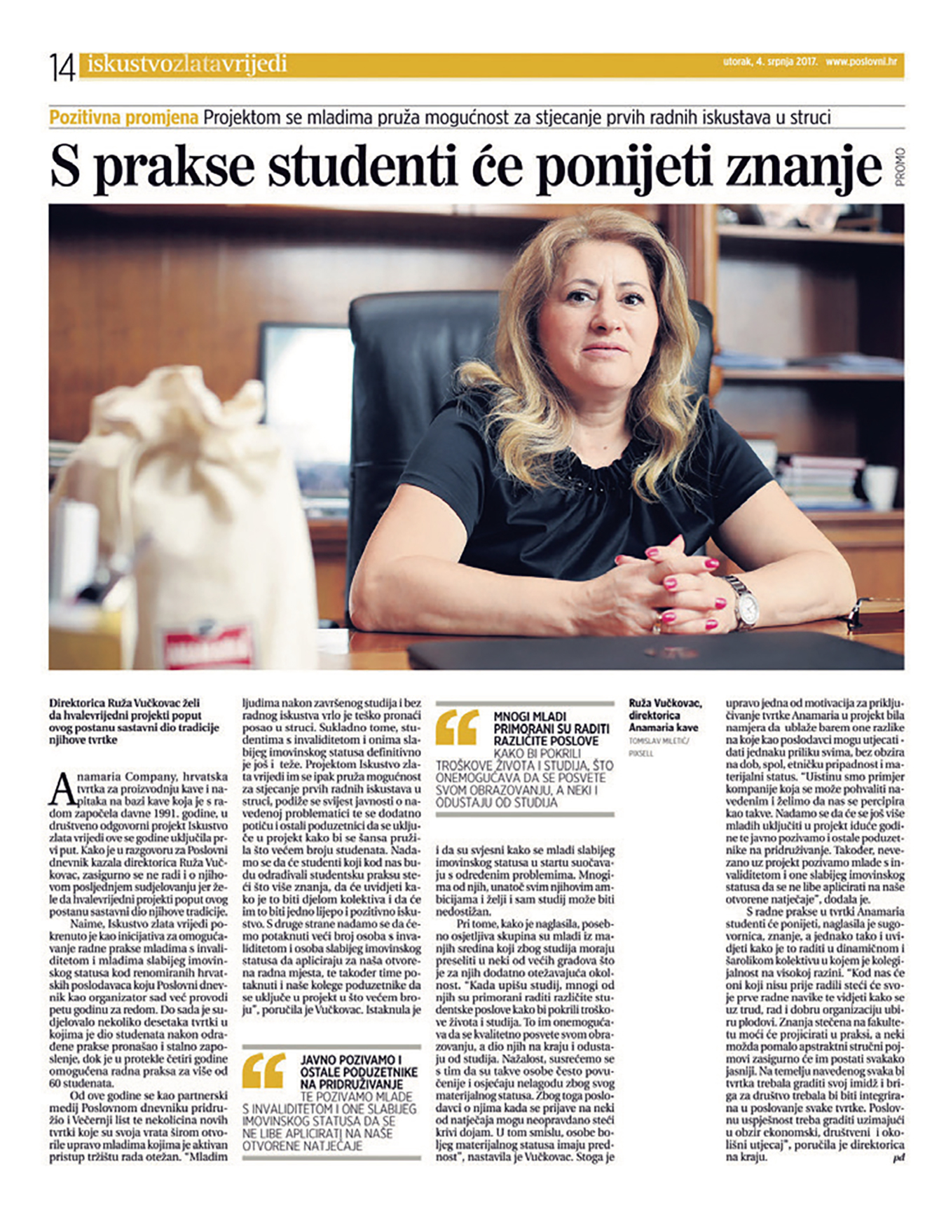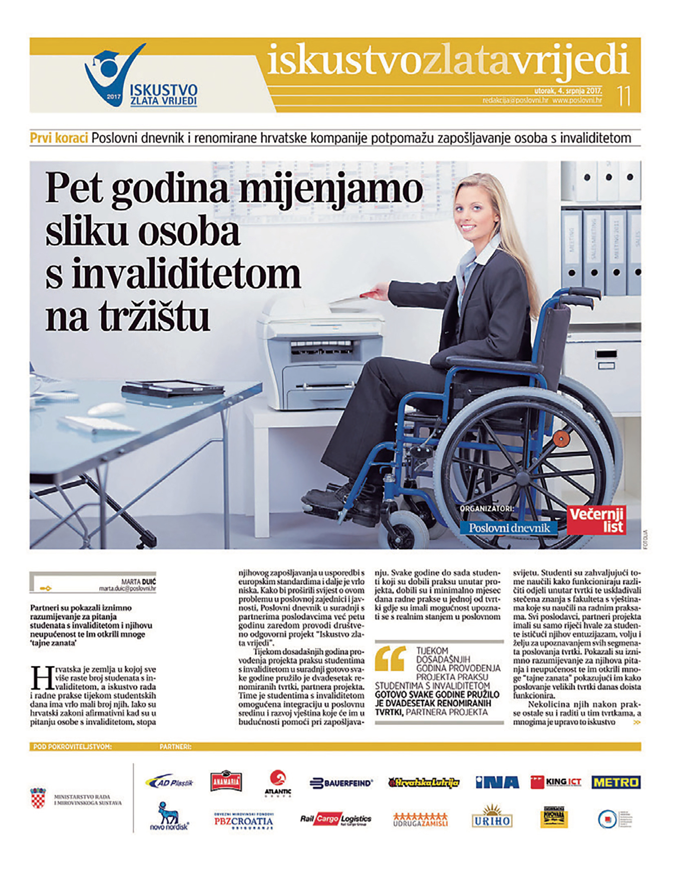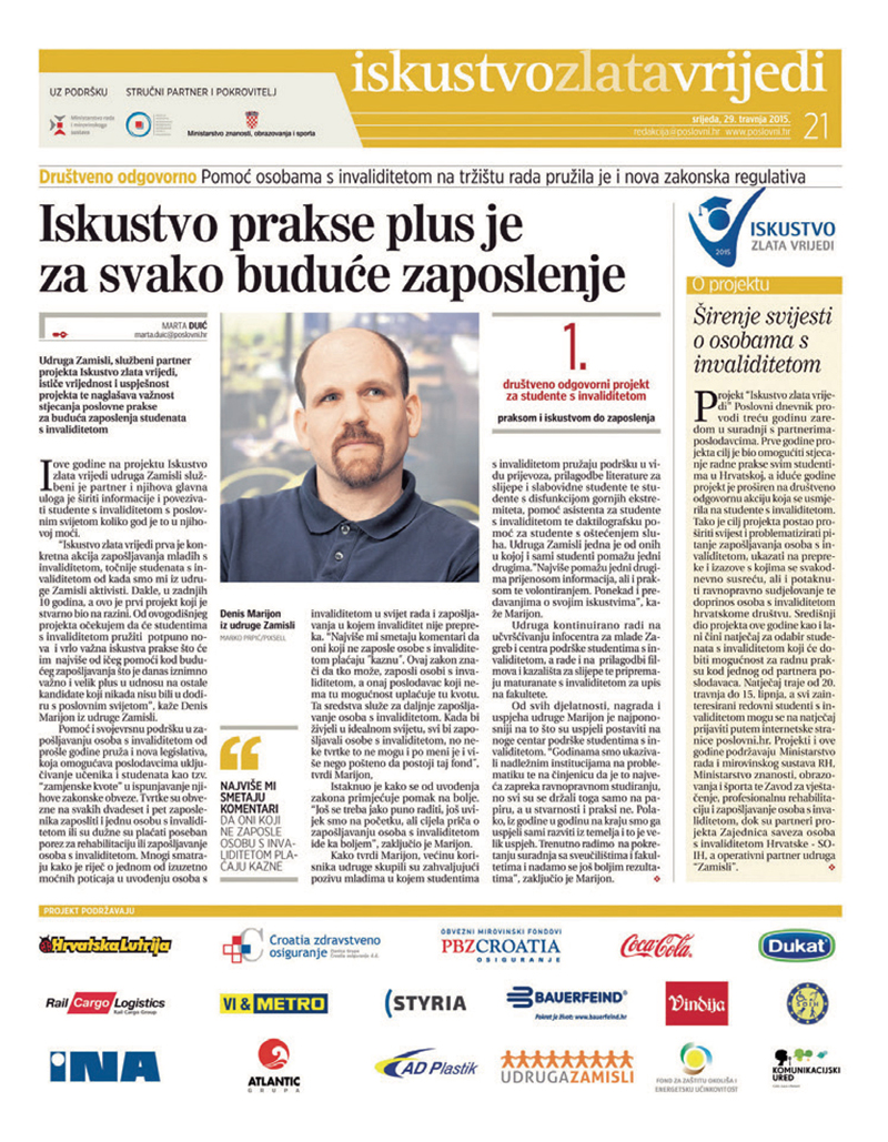 Poslovni dnevnik već tradicionalno putem društveno odgovornog projekta “Iskustvo zlata vrijedi” spaja partnere poslodavce sa studentima s invaliditetom i studentima slabijeg materijalnog statusa, s ciljem omogućavanja prakse i radi lakšeg zapošljavanja u budućnosti. Ovako otprilike izgleda naše priopćenje koje već 10 godina izlazi van, a naći će te ga na gotovo svim mjestima gdje na mreži svih mreža upišete Iskustvo zlata vrijedi.