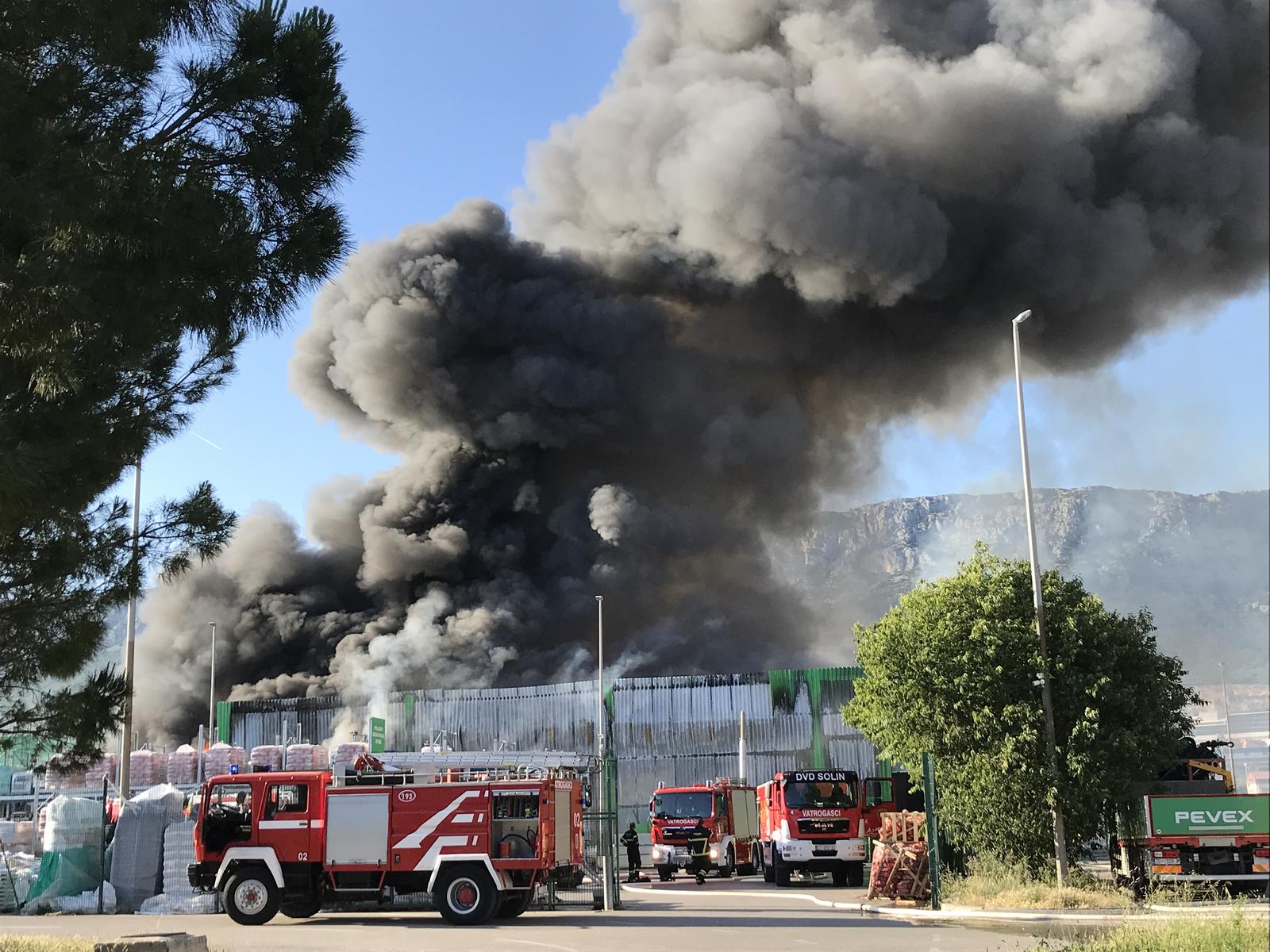 Još nije proglašen ugašenim požar koji je u ponedjeljak popodne buknuo u skladištu Pevexa u Kaštel Sućurcu, a materijalna šteta mogla bi biti veća.