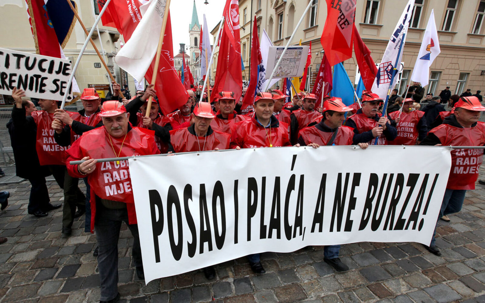 Kolona sindikalista  pod motom "Živi zid za obranu radnih mjesta: posao i plaća, a ne burza!" bila je krenula od Radničkog doma prema Markovu trgu.