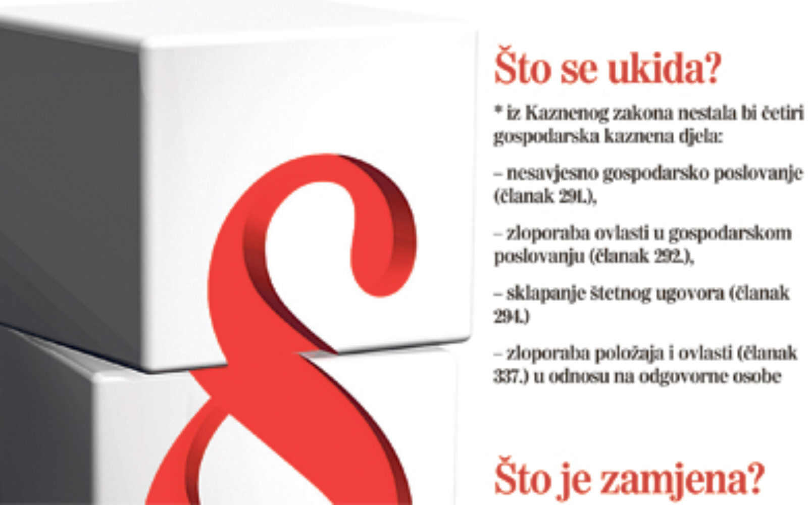 Pored tih zloporaba u odnosu na odgovorne osobe, tj. menadžere u novo kazneno djelo spojili bi se: nesavjesno gospodarsko poslovanje (članak 291.), zloporaba ovlasti u gospodarskom poslovanju (članak 292.) i sklapanje štetnog ugovora (članak 294.). Ako prijedlog prihvati Radna skupina za izmjene Kaznenog zakona (predvodi je profesorica Ksenija Turković, također s Pravnog fakulteta u Zagrebu), Vlada bi na stol dobila prijedlog istovjetnog rješenja koje je na snazi u Njemačkoj, Austriji i Švicarskoj za važan segment gospodarskoga kriminala koji u praksi u Hrvatskoj stvara brojne nedomice zbog pitanja razgraničenja kaznenih djela, ali i rješenja neprimjerenih tržišnom gospodarstvu. “Treba temeljito preurediti gospodarska kaznena djela u KZ-u i otkloniti relikte prošlosti. Iz bivšeg sustava administrativnog socijalizma preuzeto je rješenje da su odgovorene osobe u gospodarskom poslovanju izjednačene sa službenim osobama. Više ne može opstati da menadžere tretirate na isti način kao službenike. Kaznenu odgovornost menadžera u tržišnom gospodarstvu najprimjerenije je regulirati prema modelu poznatom u suvremenom europskom pravu kao ‘untreue’ ili nevjernost, što u prenesenom smislu riječi znači zloporabu povjerenja menadžera”, objašnjava Novoselec. Tko je u tom slučaju nevjeran, pita Novoselec i kaže: “Menadžment je odgovoran onima koji su mu povjerili imovinu na upravljanje. On mora voditi brigu i postupati s pažnjom savjesnoga gospodarstvenika, što znači da ne smije trpati u svoj džep i rasipati tuđu imovinu.” Tvrdi da bi se novim rješenjem, uključujući i težinu zaprijećene sankcije, sve pojednostavilo i izjednačilo s modernim europskim kaznenim pravom. Sankcija bi za temeljni oblik iznosila do pet godina zatvora, dok bi se za kvalificirani oblik – kojim je nastala znatnija šteta, propisao maksimalni zatvor od deset godina. To bi značilo i stroži režim od postojećeg za neka djela poput nesavjesnoga gospodarskog poslovanja gdje je kazna zatvora sada najviše pet godina. Pored toga odgovornost bi postojala i u slučaju neizravne namjere menadžera, što zapravo ukazuje na širu odgovornost jer kod zloporabe položaja i ovlasti treba dokazati namjeru, što je teže. Od neizravne namjere pak do nehaja za koji se ne odgovora je tanka crta, a tužiteljima bi se riješio problem češćih preklapanja postojećih kaznenih djela. O nacrtu će biti riječi na okruglom stolu o novinama u kaznenom pravu u petak na kojem će sudjelovati i ministar pravosuđa Dražen Bošnjaković.