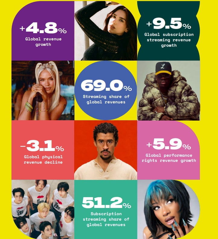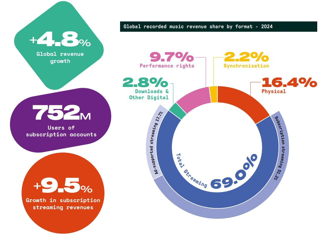 Podaci objavljeni u IFPI-jevom izvještaju Global Music Report 2025 otkrili su kako je ukupan prihod u 2024. dosegnuo 29,6 milijardu američkih dolara, što je porast od 4,8%.