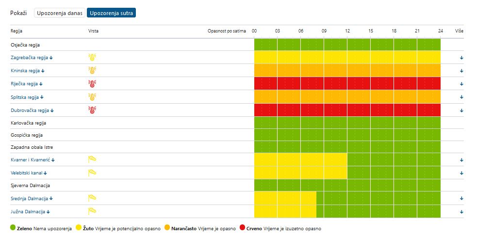 Danas će diljem Hrvatske biti sunčano i vruće, u unutrašnjosti uz slab dnevni razvoj oblaka. Vjetar će na kopnu biti uglavnom slab, dok će na Jadranu puhati slaba i umjerena bura, još prijepodne mjestimice i jaka, prema otvorenom moru sjeverozapadnjak. Najniža jutarnja temperatura od 17 do 22, na moru od 22 do 27, a najviša dnevna uglavnom od 31 do 36°C.