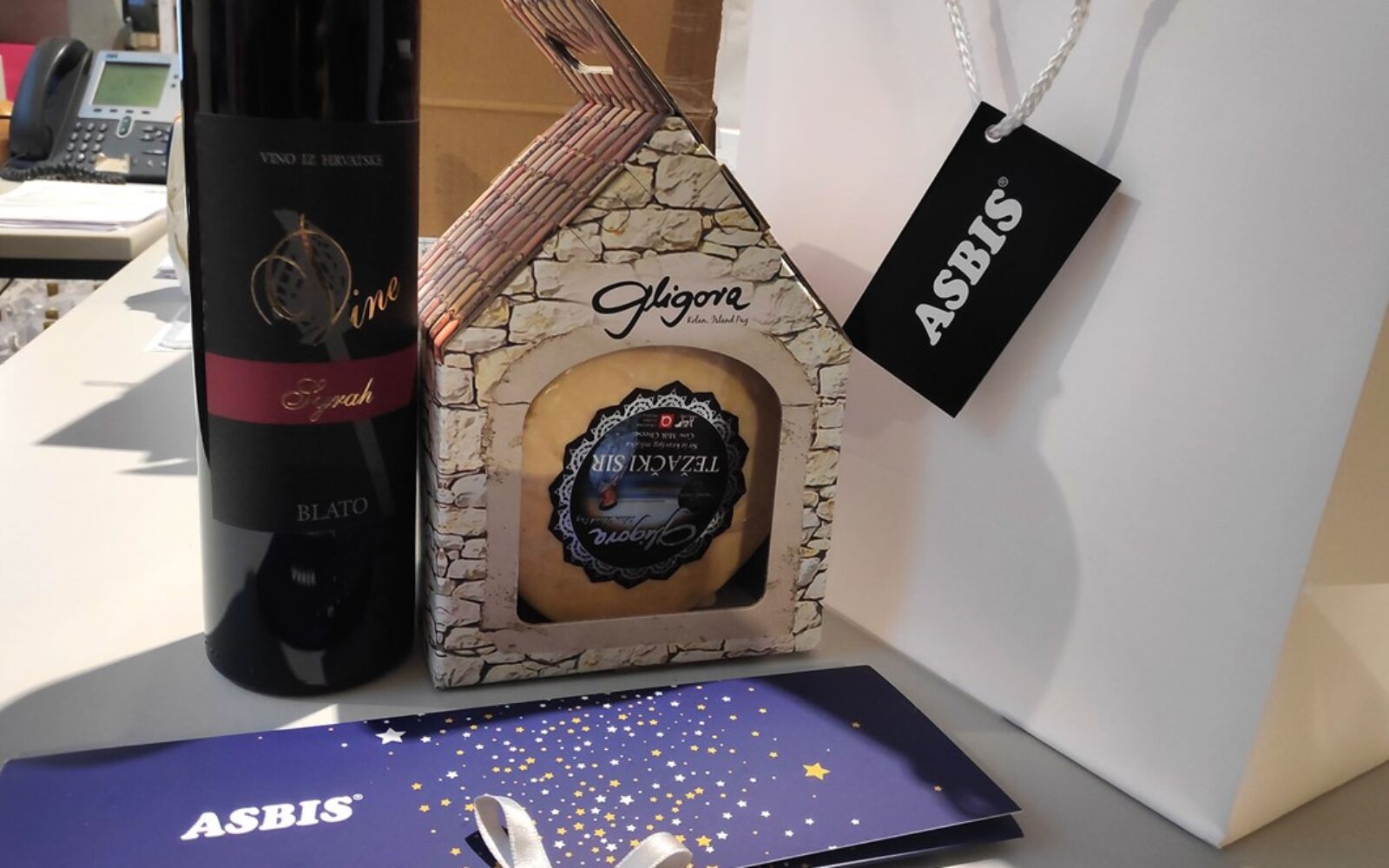 Vinarija Dine, iz Blata s Korčule, obogatila je Asbisov poklon paket Syrah crnim vinima i Pošip bijelim vinima. Dok je naša, a svjetski poznata sirana Gligora probrala najbolje sireve u elegantnim pakiranjima, koji će izvrsno odgovarati odabranim vinima.