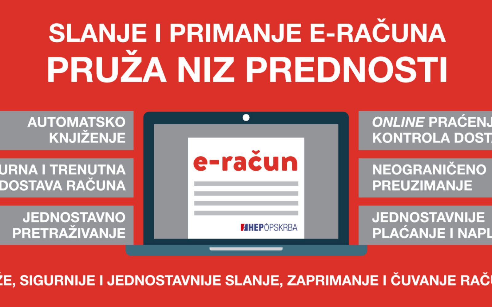 U HEP Opskrbi vjeruju kako su sigurnost isporuke električne energije te jednostavnost ugovaranja i korištenja usluga presudni za dugoročno zadovoljstvo kupaca, zbog čega je kupcima iz kategorije poduzetništva omogućeno zaprimanje računa u elektroničkom obliku, tzv. e-račun. Prema nacionalnim zakonima i pravilnicima, računom se smatra i račun koji se izdaje i zaprima u elektroničkom obliku, pod uvjetom da postoji pisana suglasnost primatelja za prihvat takvih računa.