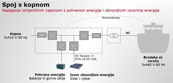 Elektrifikacija kroz pretvorbu snage. Spajanjem na priključak s kopna dok su na vezu, plovila mogu potpuno ugasiti svoje pomoćne generatore i dizel motore. Njime se također osigurava napajanje el. energijom plovila, za punjenje baterija na brodu instaliranih u hibridnim ili brodovima na električni pogon.