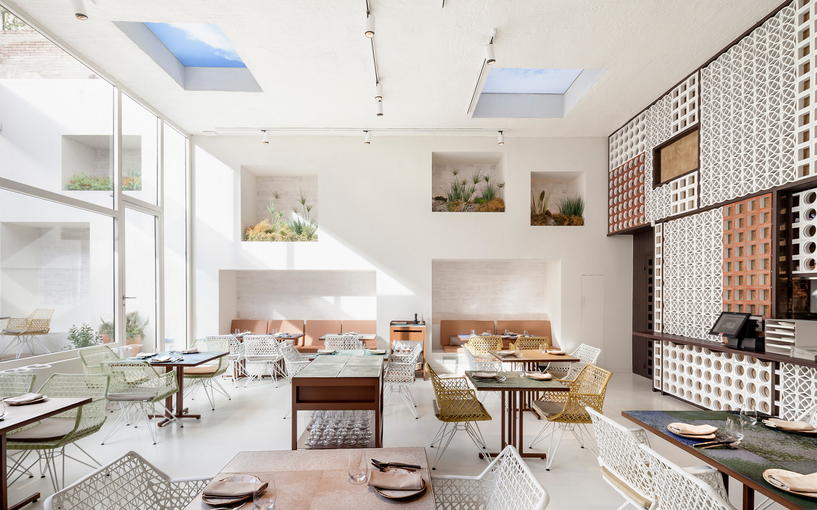 Baš kao što interpretacija Disfrutarovih jela nastoji dočarati Mediteran u jednom modernom izričaju, tako i interijer prostora odiše mediteranskim nasljeđem. Već na samom ulazu možete primijetiti radove od lijevanog željeza inspirirane od susjedne tržnice. Epicentar prostorije zauzima otvorena kuhinja dekorirana s pločicama od gline – baš kao što je to slučaj u malim ribarskim mjestima poput Cadaquésa. Iza restorana nalazi se vrlo ugodna terasa koja podsjeća na oazu, no svakako najupečatljiviji dio interijera su uzorci keramike u crvenoj, narančastoj, žutoj i crnoj boji, kojima restoran slavi legendarnog katalonskog slikara Joan Miróa. Restoran krase bijeli zidovi i visoki strop s krovnim prozorima naslikanim motivima oblaka. Sve se nekako vrti oko mediteranskog štiha u kojeg za čas uplovite i ostanete vezani dugo u noć.
